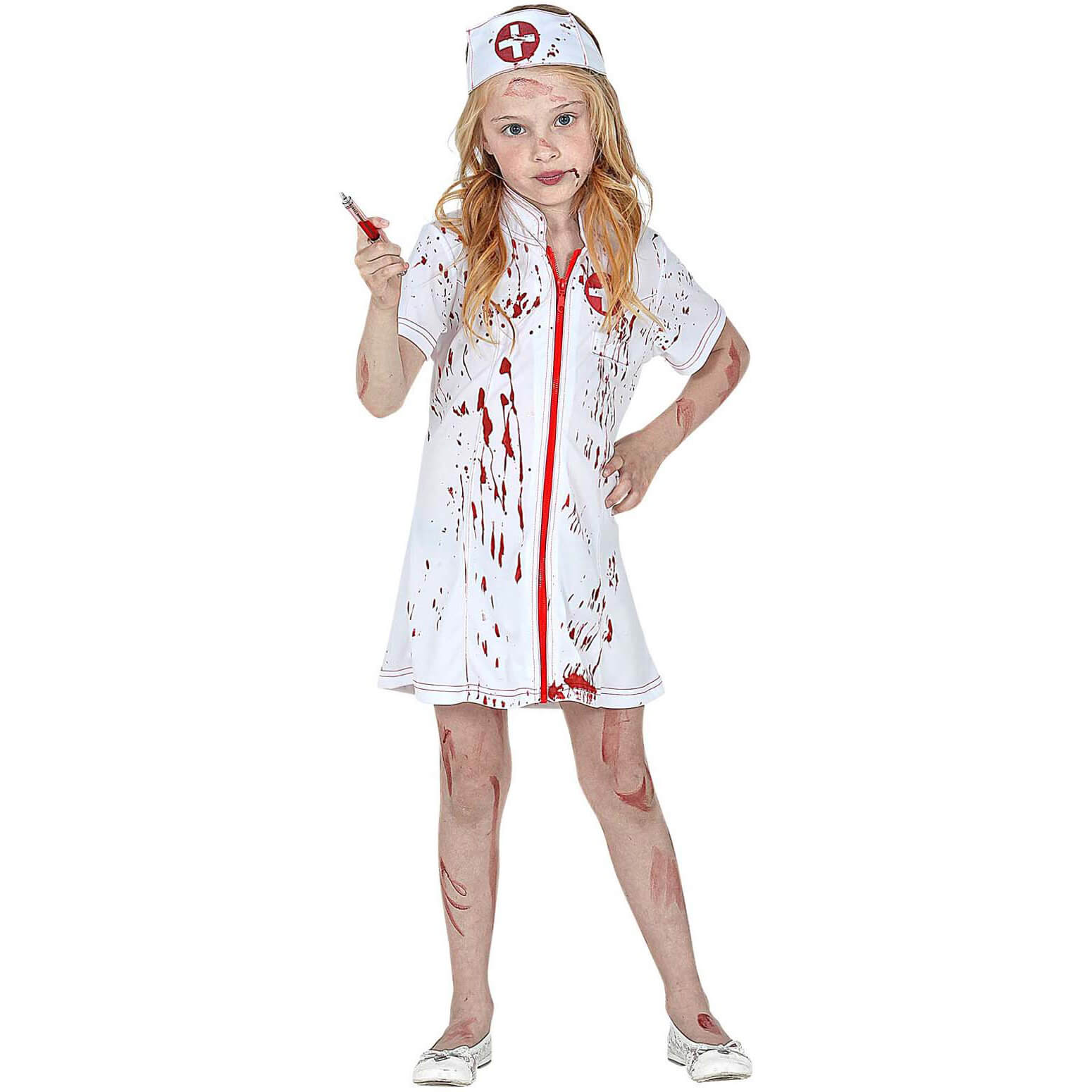 Zombie Krankenschwester blutig Kinderkostüm Kleid kurz mit Haube weiß