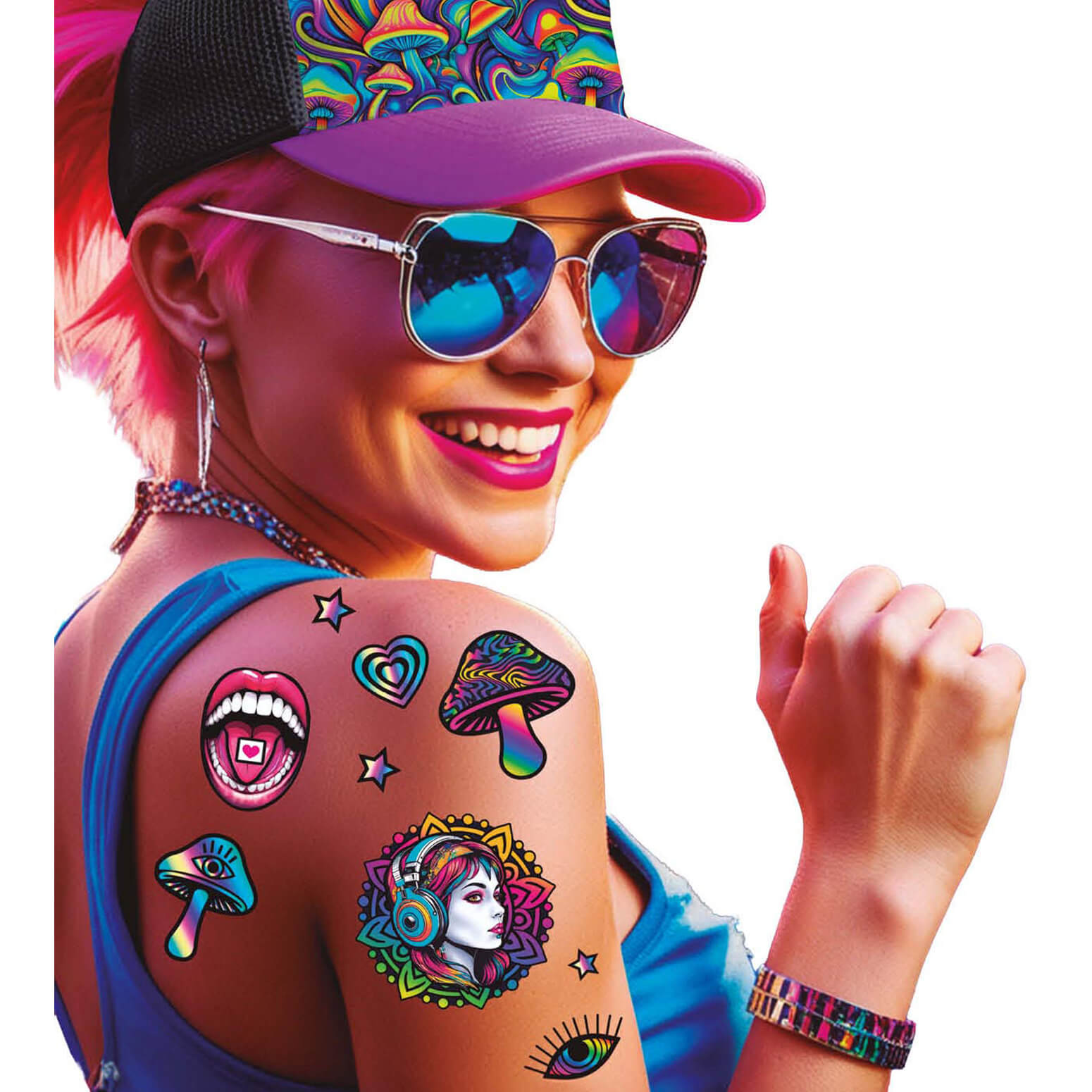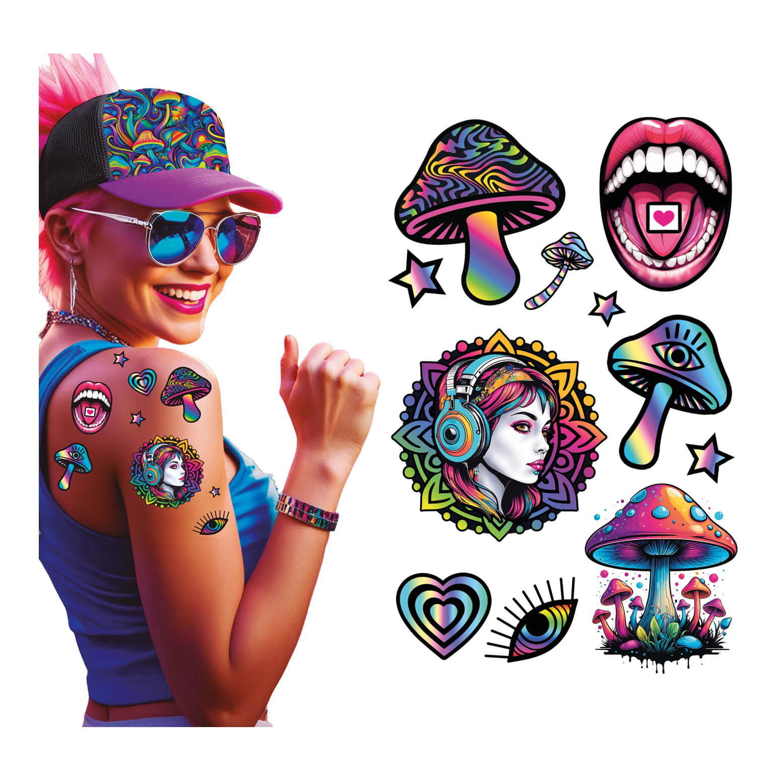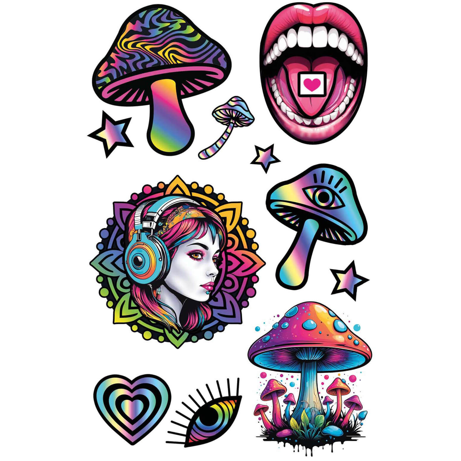 70er Jahre Hippie Psychedelic Tattoo Set Hippie 80er 90er Rave 14x30cm PILZR TATTOOS bunt