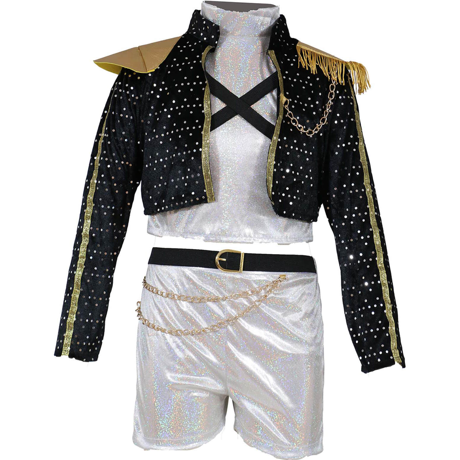 Superheldin K-Pop Kostüm Anzug kurz mit goldenen Applikationen POP-STAR SILVER LEADER schwarz-silber – (ARTIKEL/REFERNZ: 8434077787847/GU78784-8434077891056/GU89105-8434077891063/GU89106-8434077891070/GU89107 – Kategorie/Suche: K-Pop Deamon Demon Hunters Rumi Jinu Mira Zoey – Hersteller: Fiestas Girca S.L.)