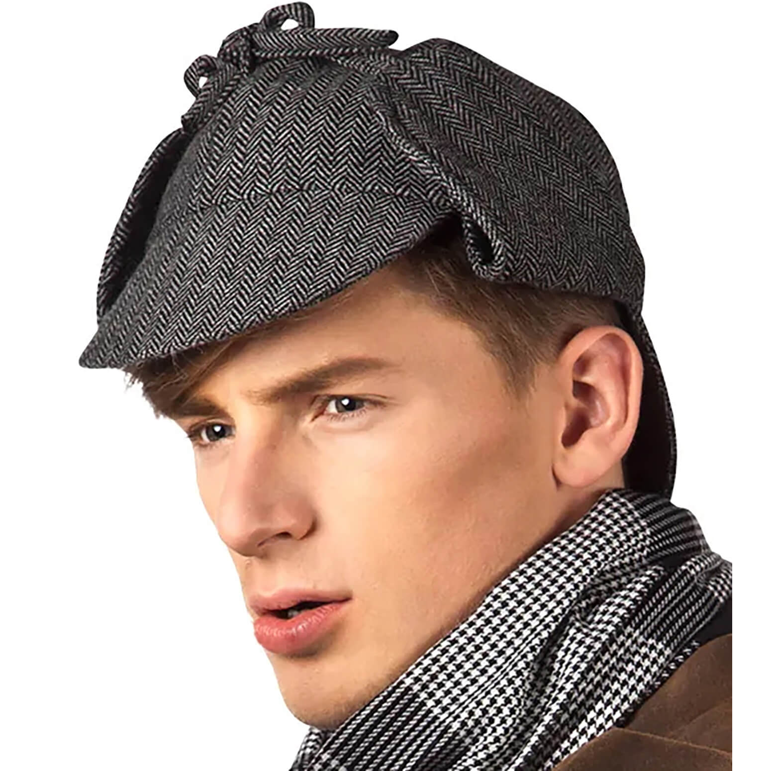 Privatdetektiv Mütze in Fischgrätmuster mit Ohrenklappen zum Binden dunkelgrau