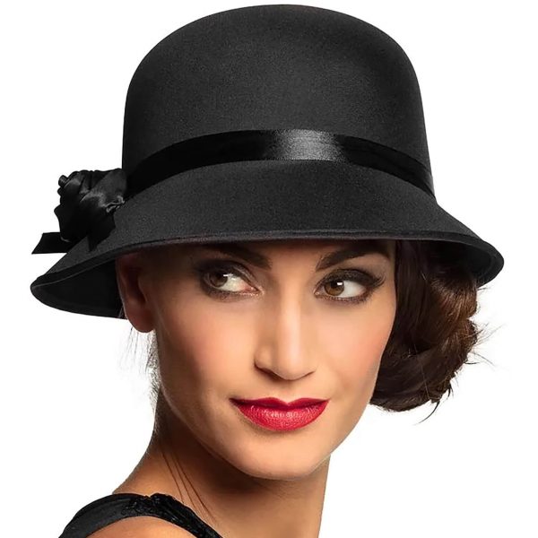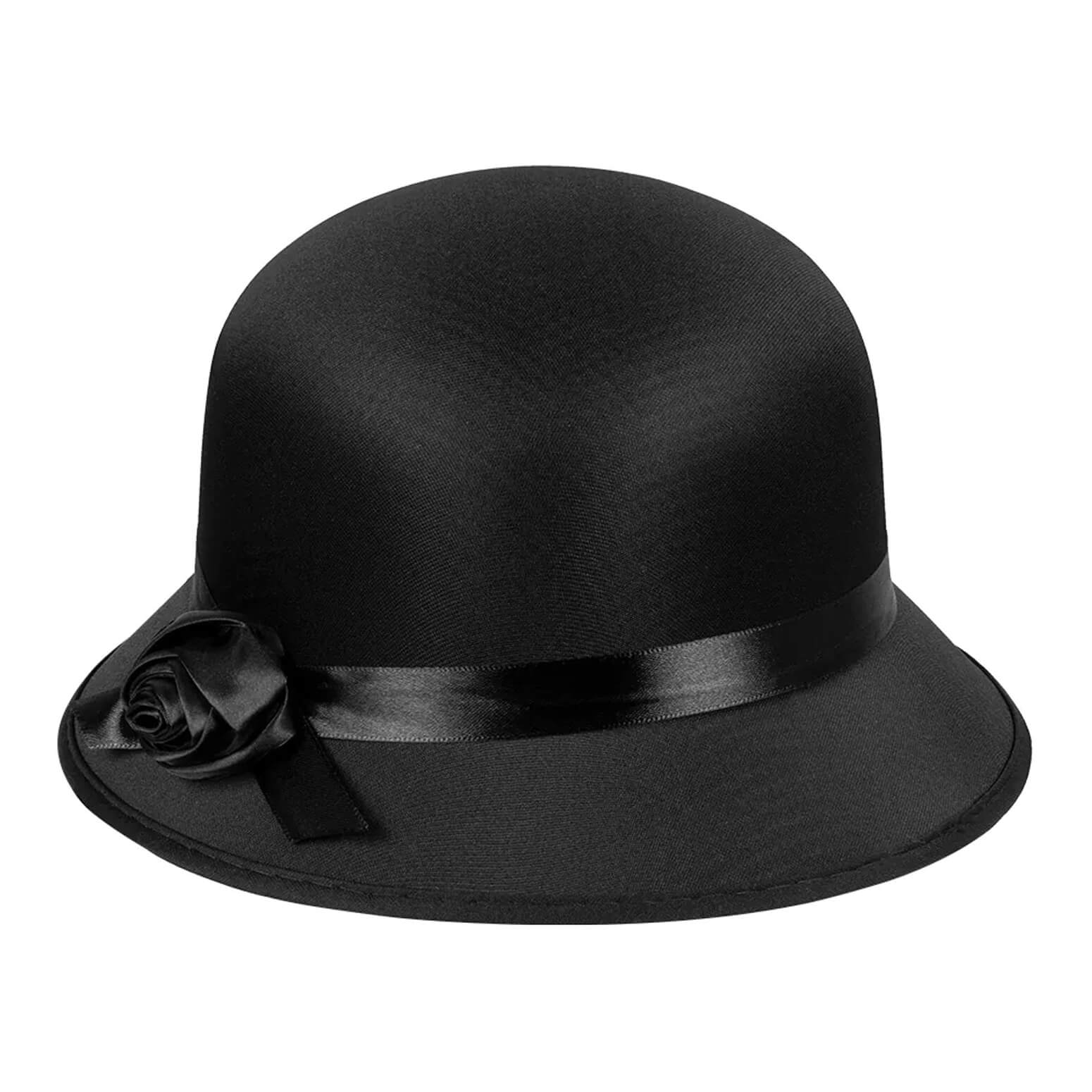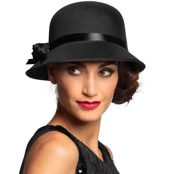 20er Jahre Charlestonlady Damenhut Topfhut feste Qualität mit Satinblume schwarz – (ARTIKEL/REFERNZ: 8712026043092/BO04309 – Kategorie/Suche: Cloche – Hersteller: Boland BV)