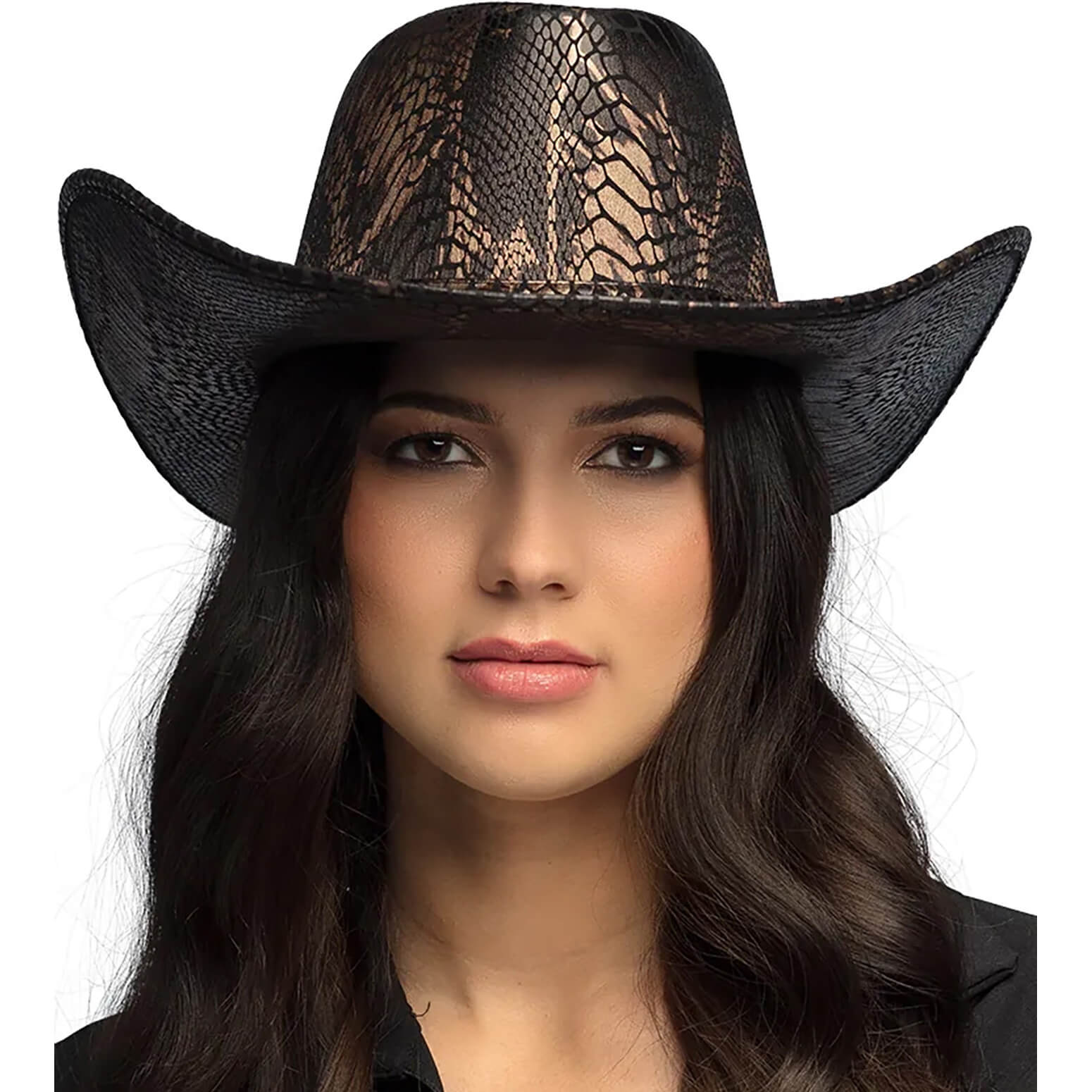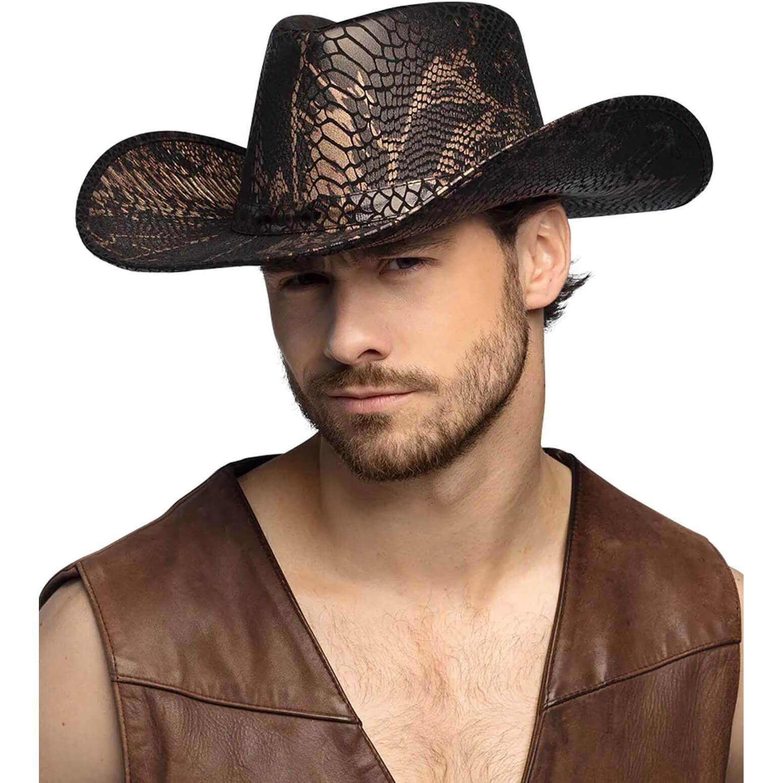 Cowgirl Cowboy/Festival Cowboyhut mit Schlagnemuster bedruckt COBRA metallic schwarz-gold – (ARTIKEL/REFERNZ: 8712026043962/BO04396 – Kategorie/Suche: – Hersteller: Boland BV)
