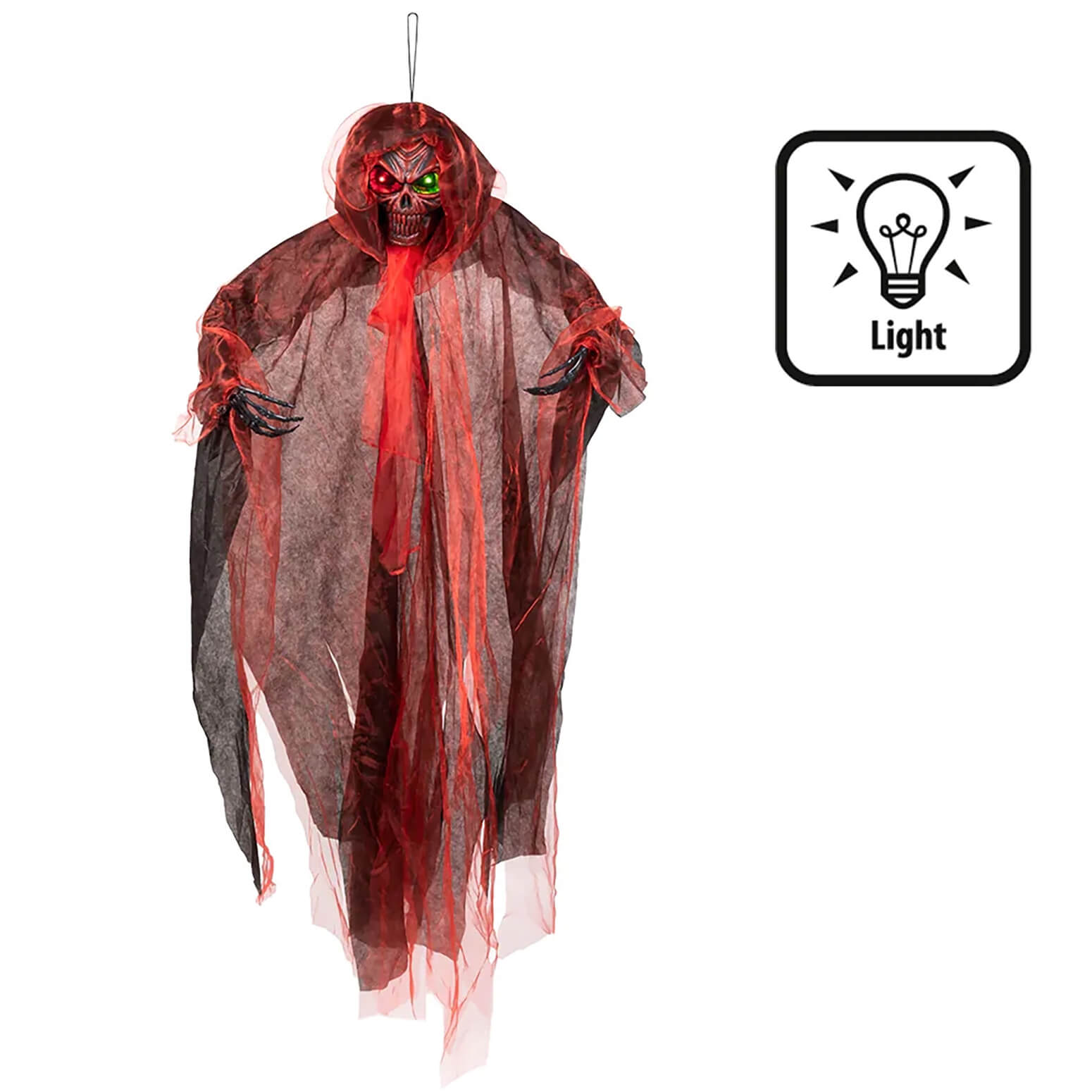 Skelett in Fetzen Deko Hängefigur mit LED 180cm DEAMON REAPER mit Leuchtaugen schwarz-rot-gold