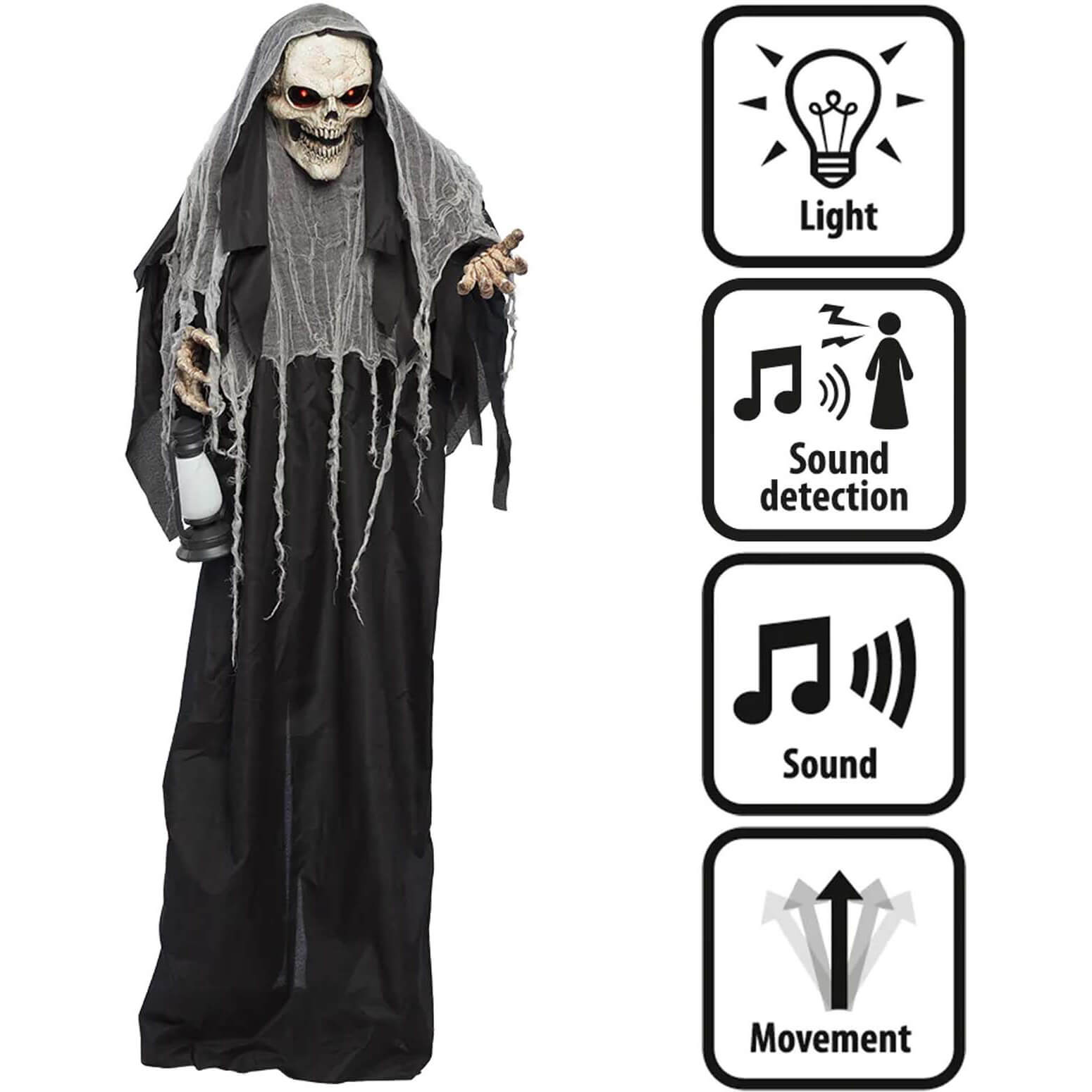 Skelett in Fetzen Deko Standfigur animiert+LED+Sound 180cm SHINING REAPER mit Laterne schwarz