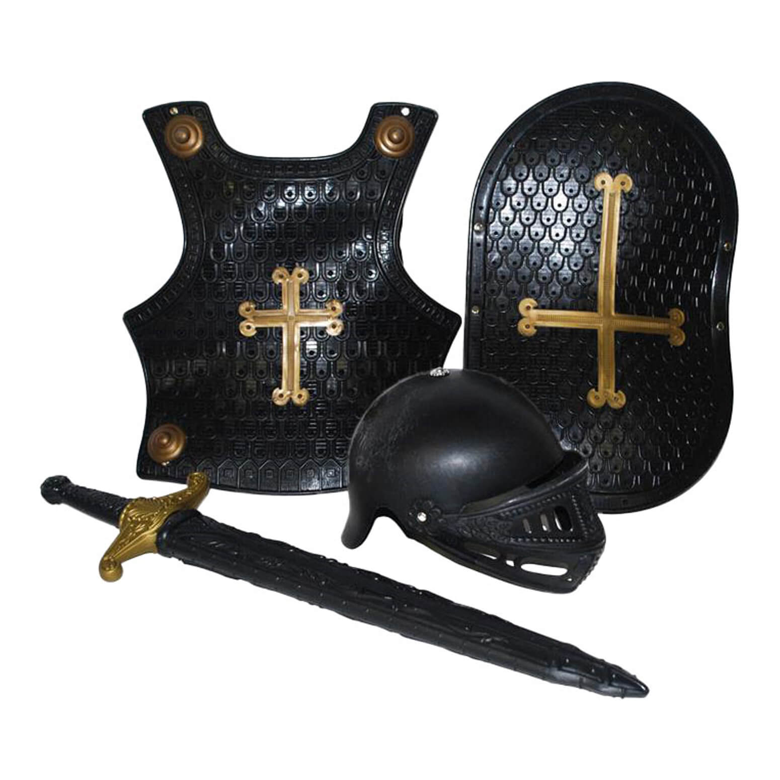 Ritter Brustpanzer+Schild-Helm+Schwert mit Kreuz aus Kunststoff in Metalloptik schwarz-gold