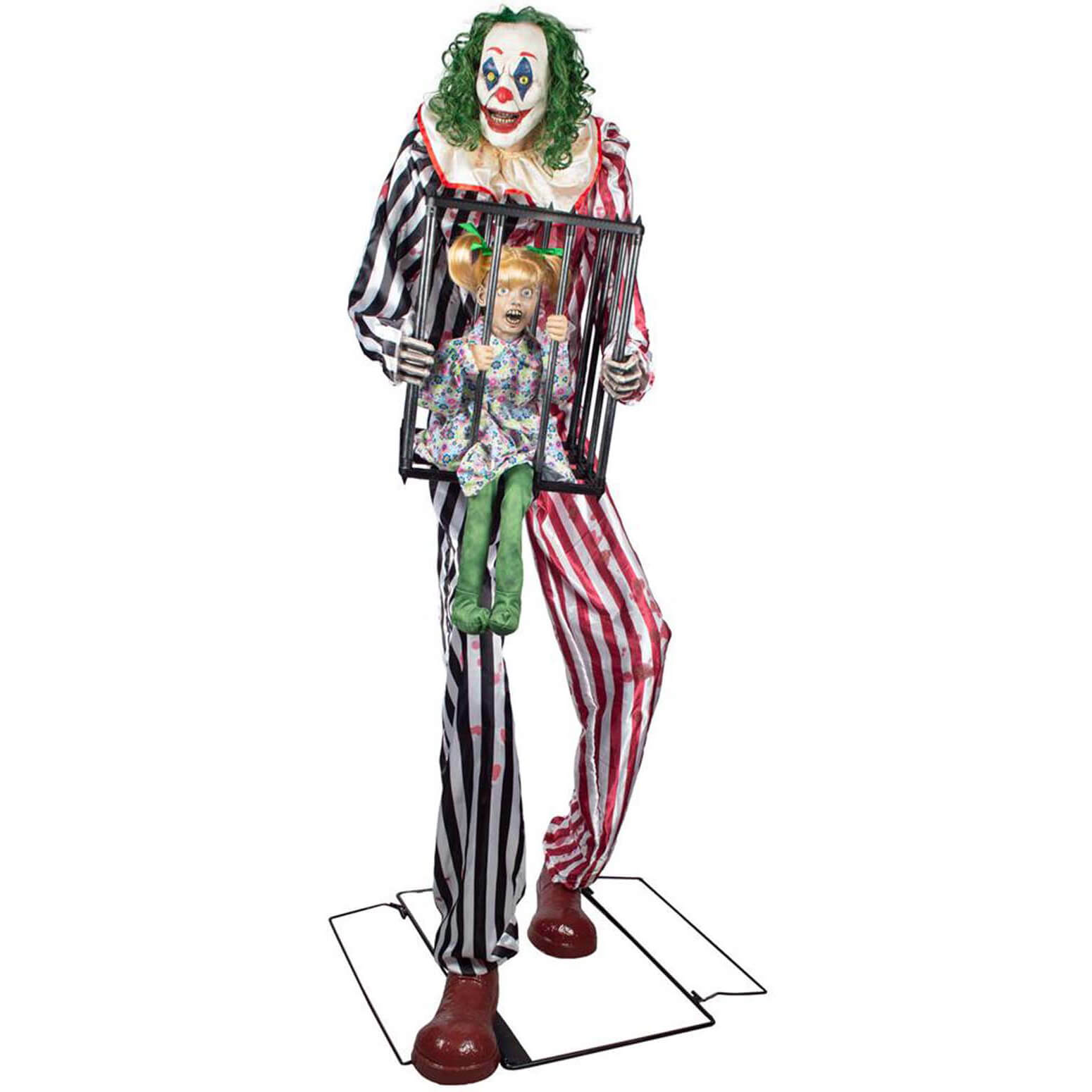 Böser Clown Deko Standfigur animiert+LED+Sound Clown mit Mädchen in einem Käfig grau-rot