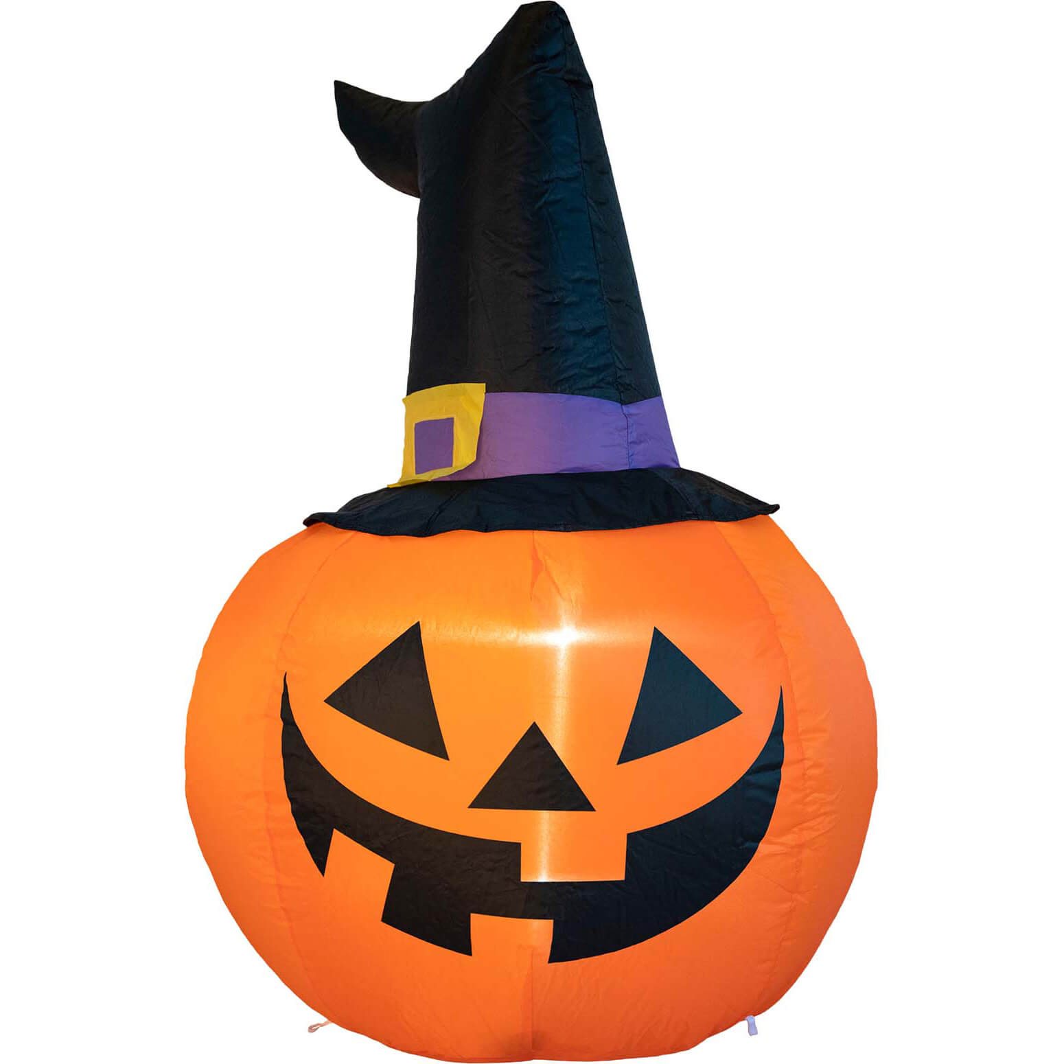 Kürbis Deko Standfigur selbstaufblasend LED mit Hut von innen beleuchtet mit Ventilator 120cm orange-schwarz