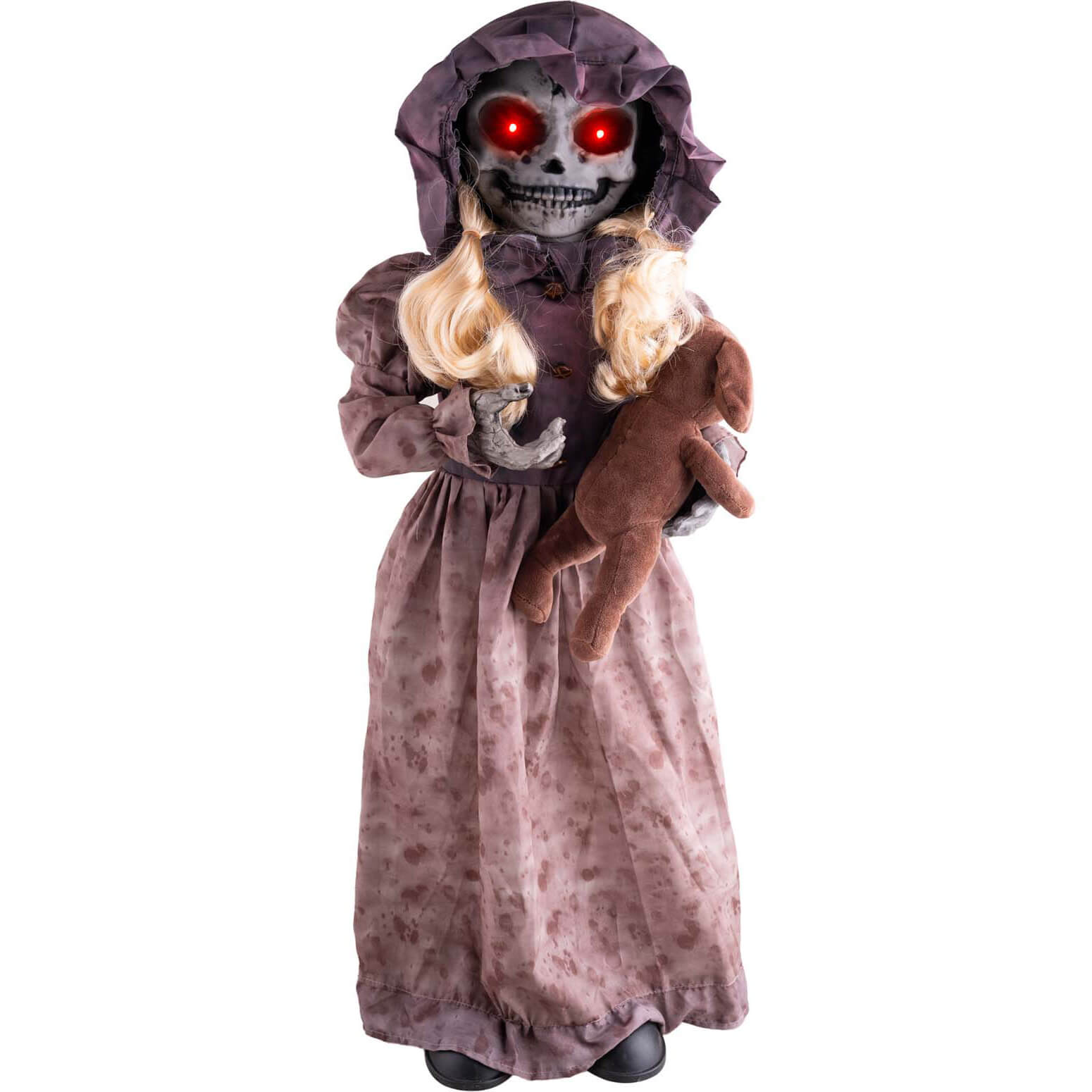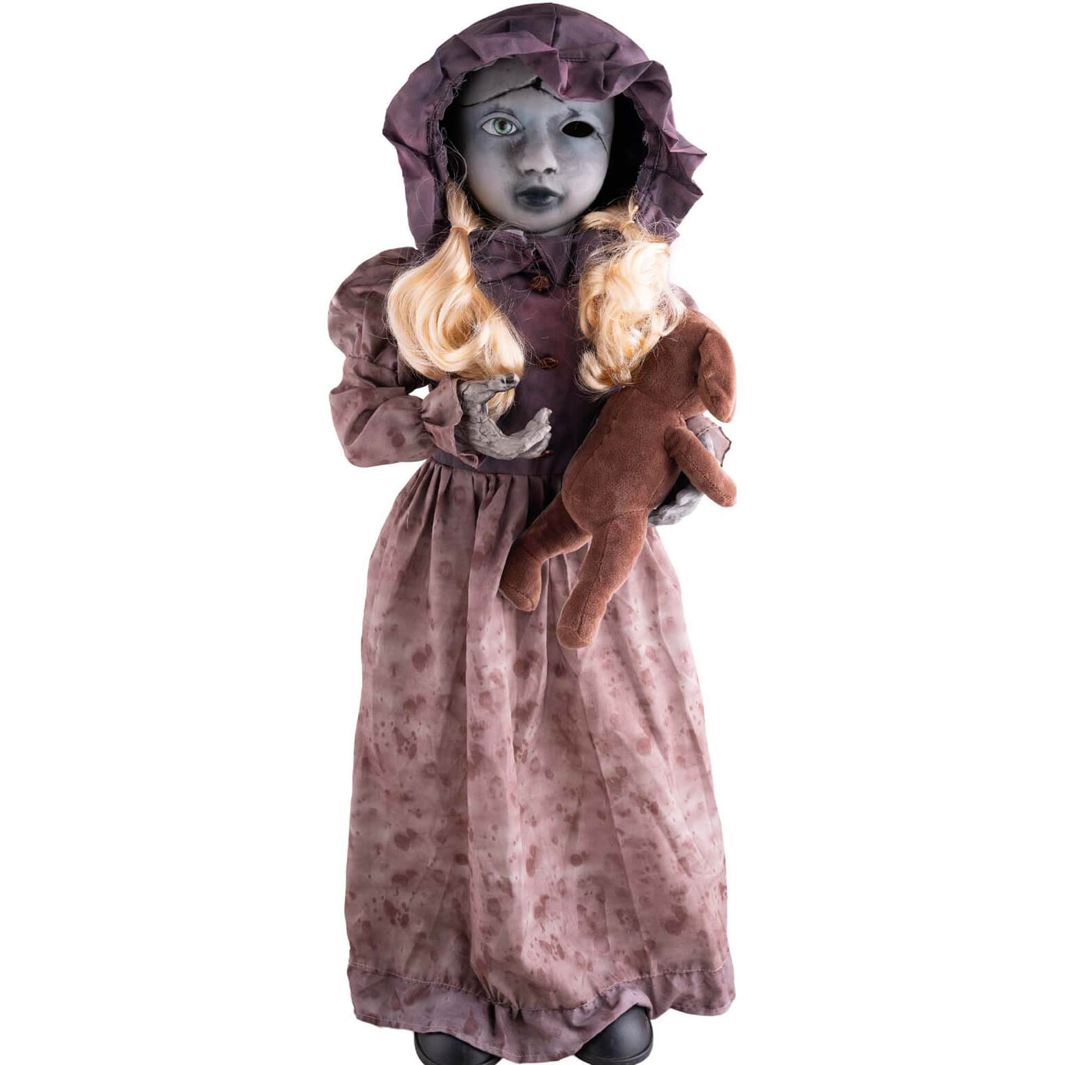 Zombiemädchen Deko Standfigur animiert+LED+Sound Horrorpuppe dreht den Kopf 95cm SPINNING HEAD DOLL rosa