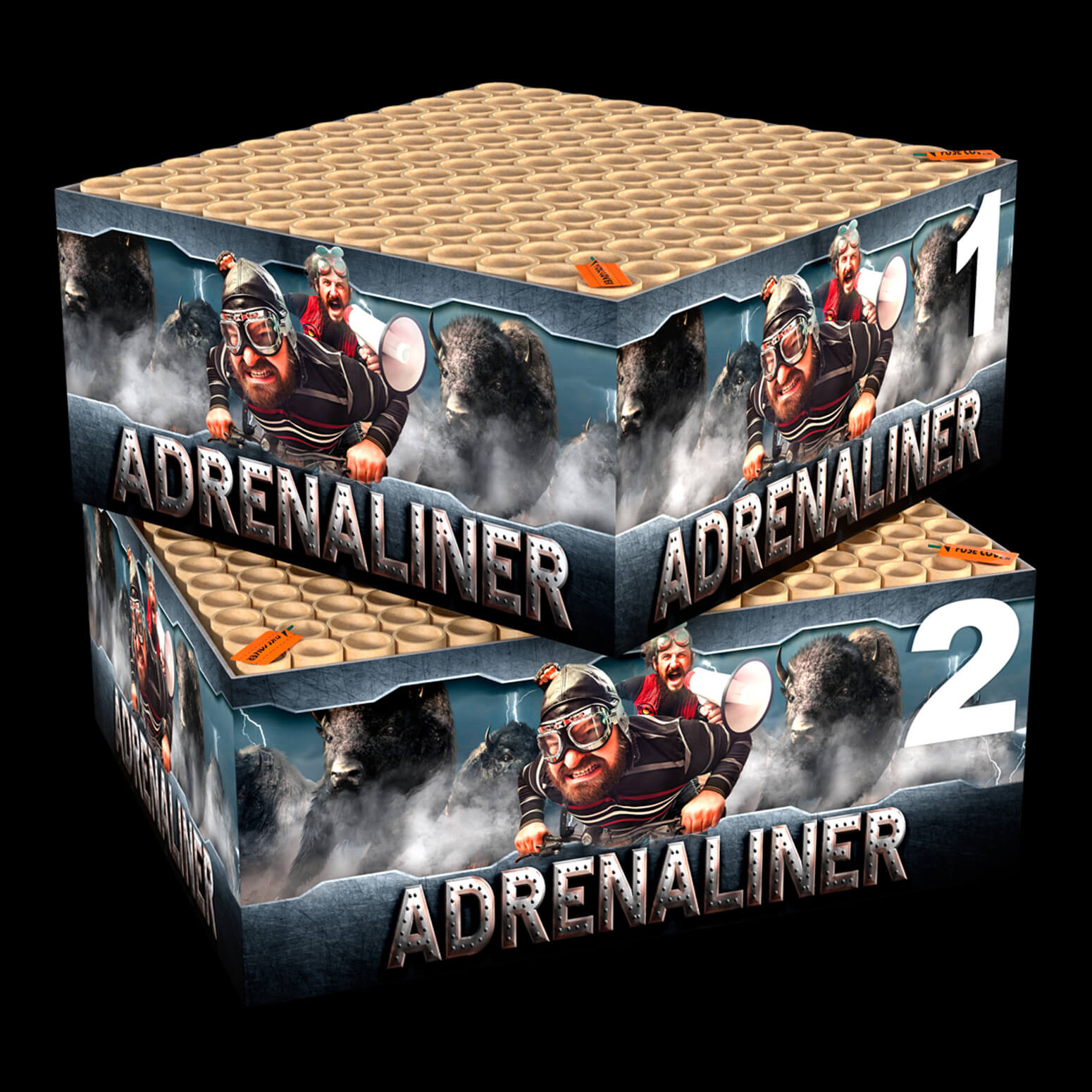 Batteriefeuerwerk Adrenaliner – Doppel-Verbund, der das Adrenalin durch deinen Körper pumpen lässt! Der erste Verbund gibt schon ordentlich Gas und ist mit verschiedenen Farben und Effekten schon eine Show für sich. Die zweite Verbund gibt Vollgas und vervollständigt die Show. Rechne damit, dass die Leute stehen und jubeln, wenn du diesen Wahnsinn erlebst!