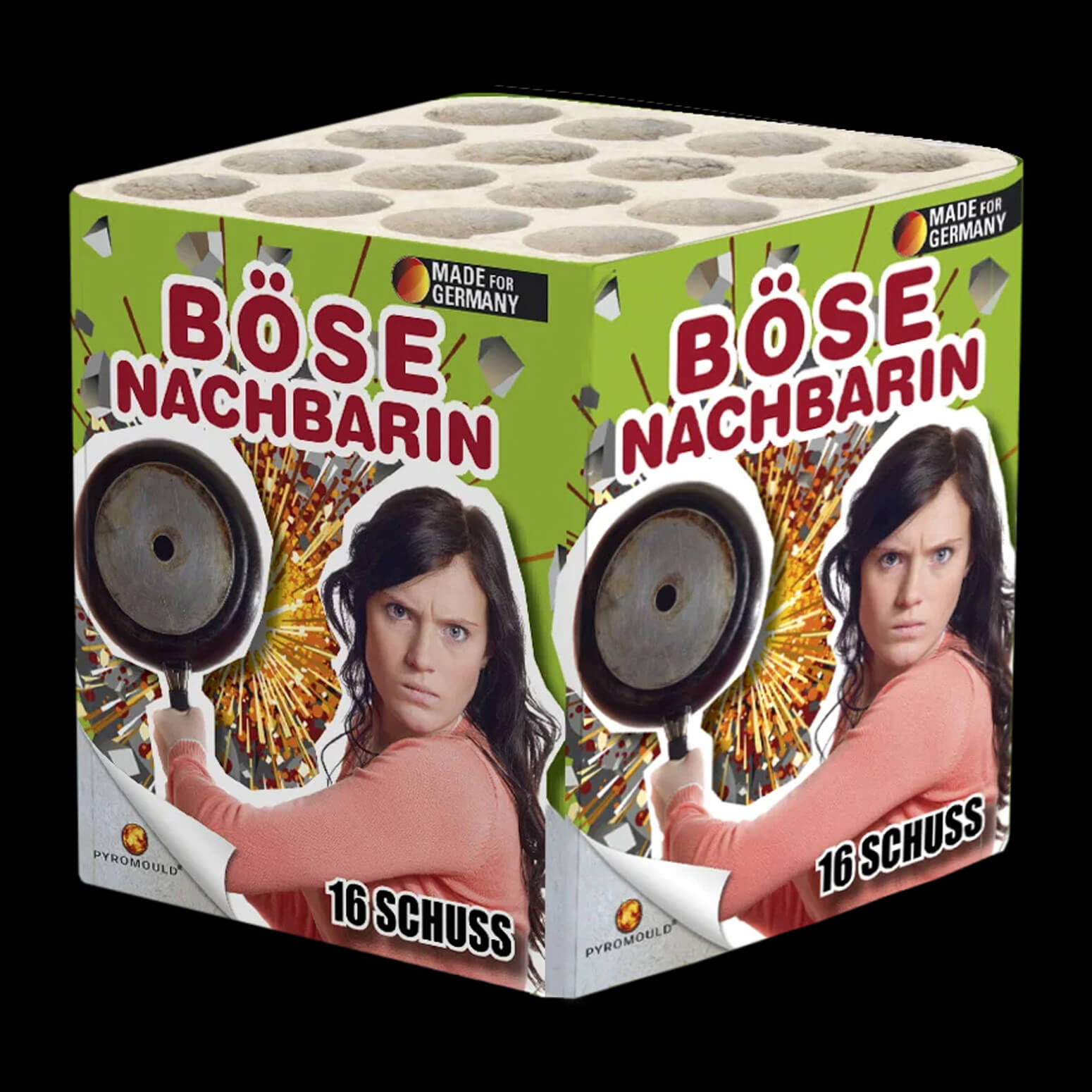 Batteriefeuerwerk Böse Nachbarin – 16-Schuss-Batterie mit roten und grünen Sternen mit Crackling.- Kaliber: 20 mm