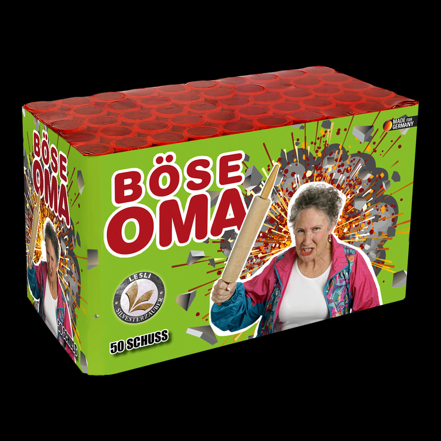 Batteriefeuerwerk Böse Oma – 50-Schuss Cocktail-Batterie mit goldenen Palmen, silbernen Blinkern, Crackling, blauem Peony und goldenem Chrysanthemum.- Kaliber: 20 mm