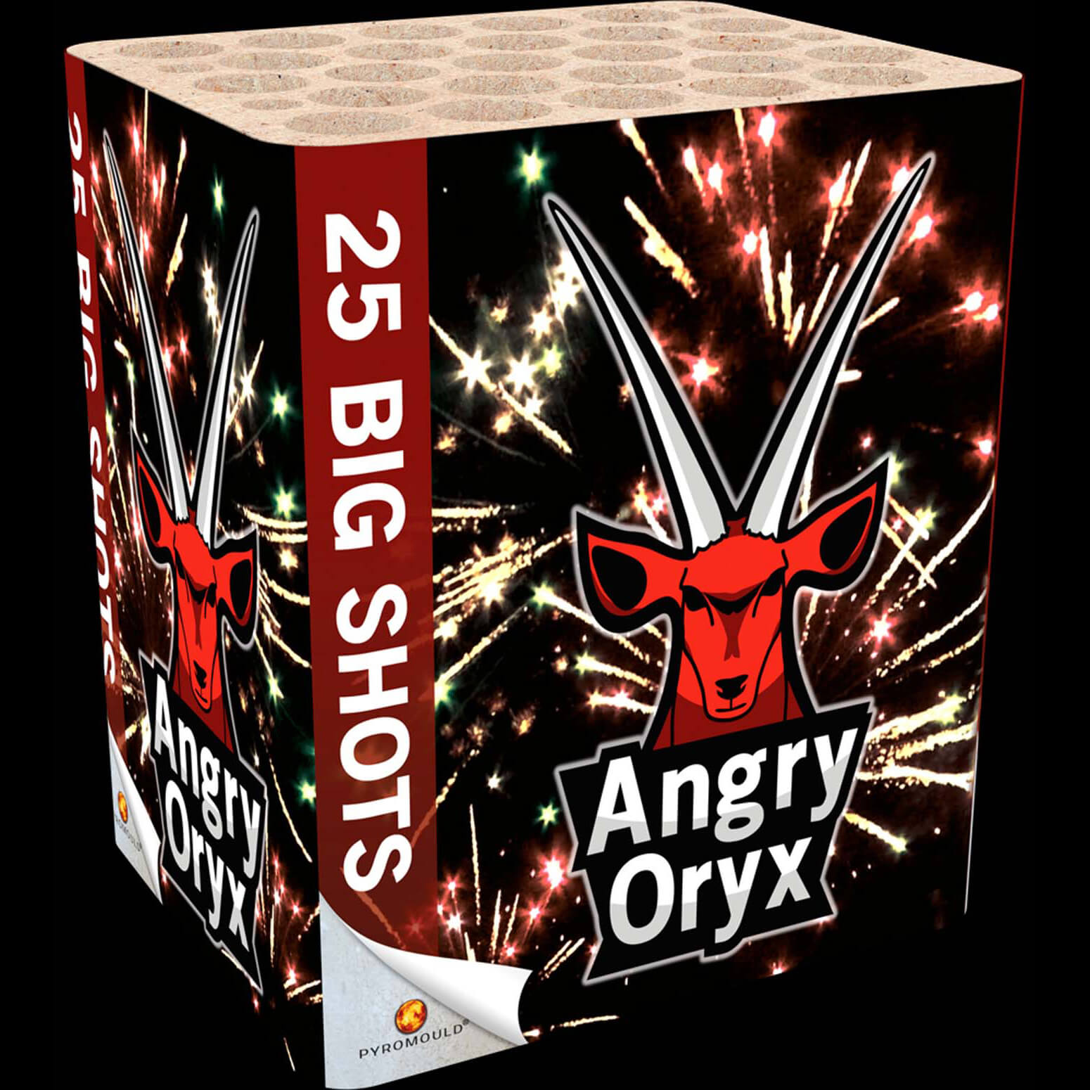 Batteriefeuerwerk Angry Oryx – Agressive Batterie mit 25 Schuss! Unter anderem mit Brokaten aus Gold, roten Blinkern, grünen Buketts und lautem Crackling-Burst. Pyromould®.- Kaliber: 30 mm