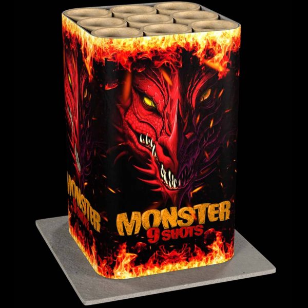 Batteriefeuerwerk Monster – 9-Schuss-Cake mit abwechselnder Brocade Crown & rotem Glitter sowie tiefblauen Sternen mit goldenem Crackling.- Kaliber: 20 mm