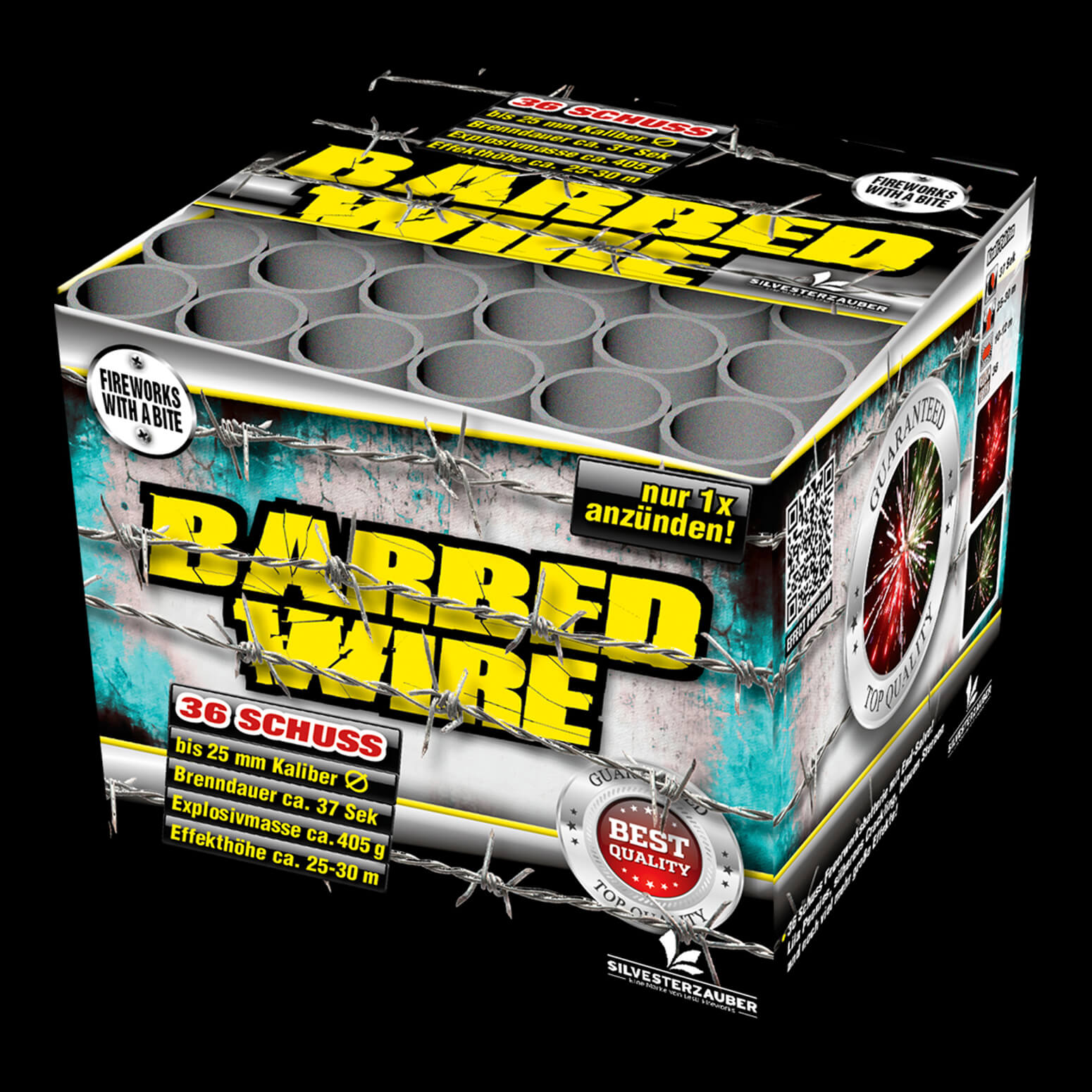 Batteriefeuerwerk Barbed Wire – 36-Schuss-Feuerwerksbatterie mit Endsalve! Lila Peonies, silbernes Crackling, blaue Sterne und viele weitere große Effekte!- Kaliber: 25 mm