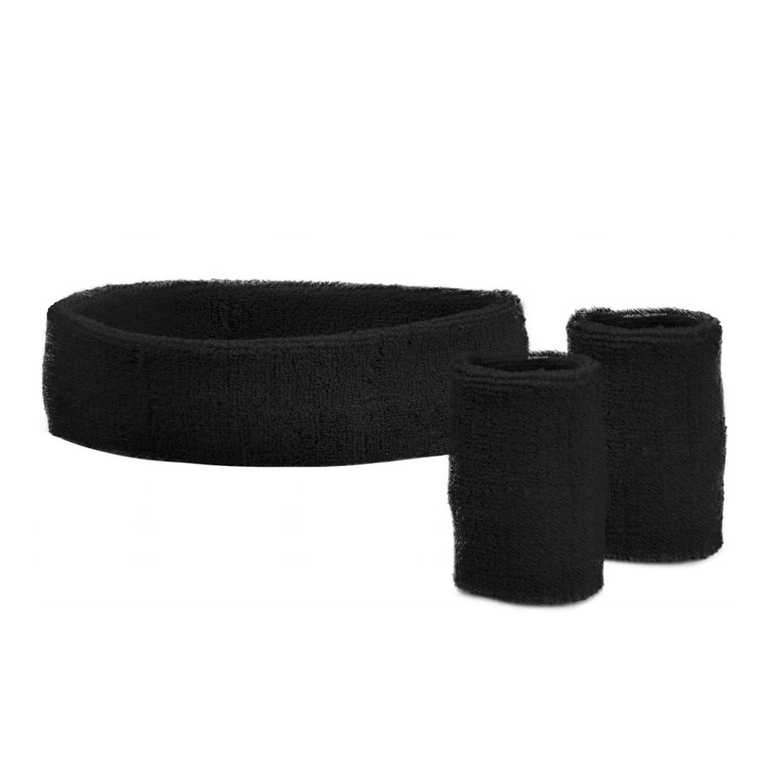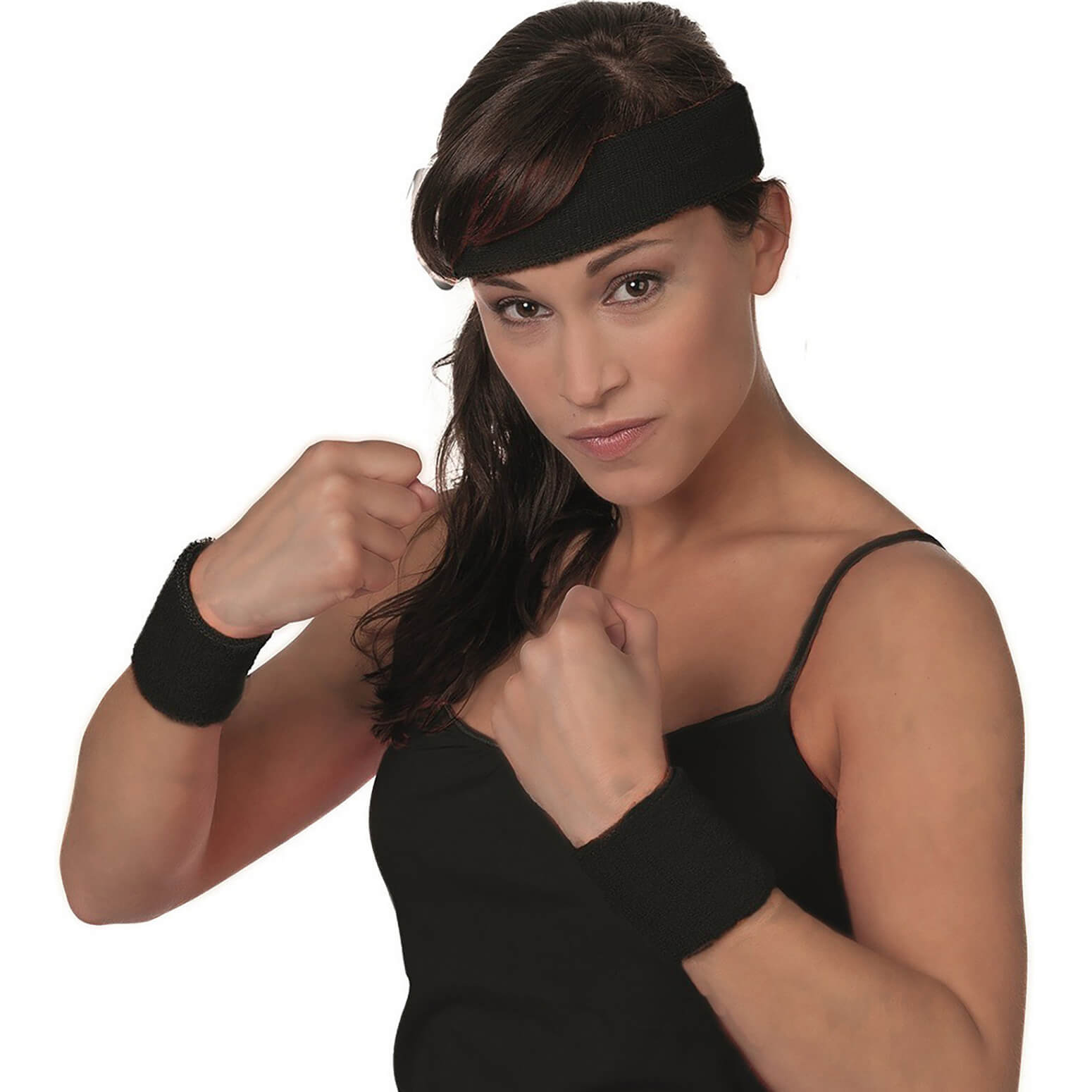 80er Jahre Aerobic Schweißband Set Stirnband+Handgelenkschweißbänder Deluxe schwarz