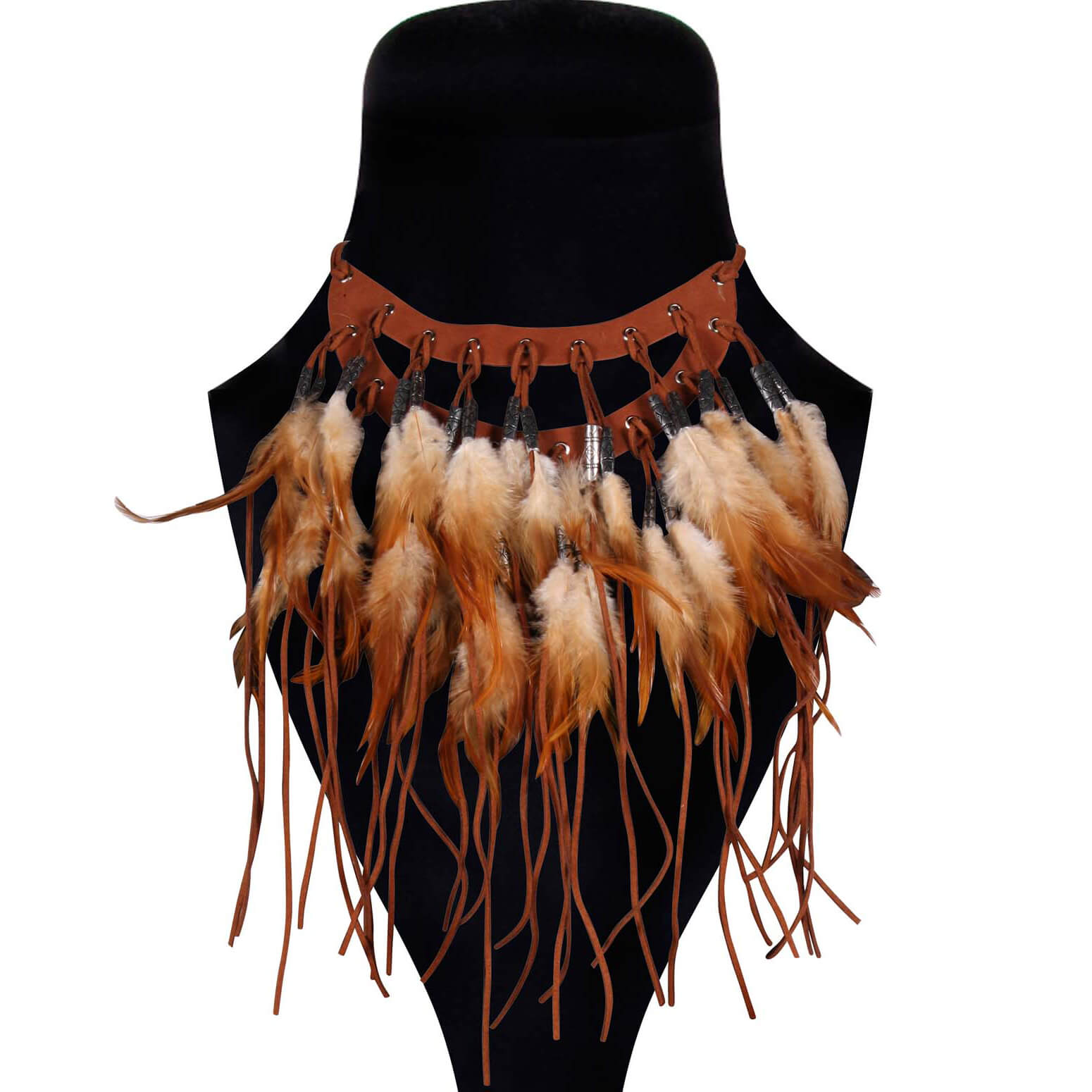 Hippie / Indianer Halskette mit Federn Ledercollier mit eleganten Federn NAYAVU hellbraun-dunkelbraun