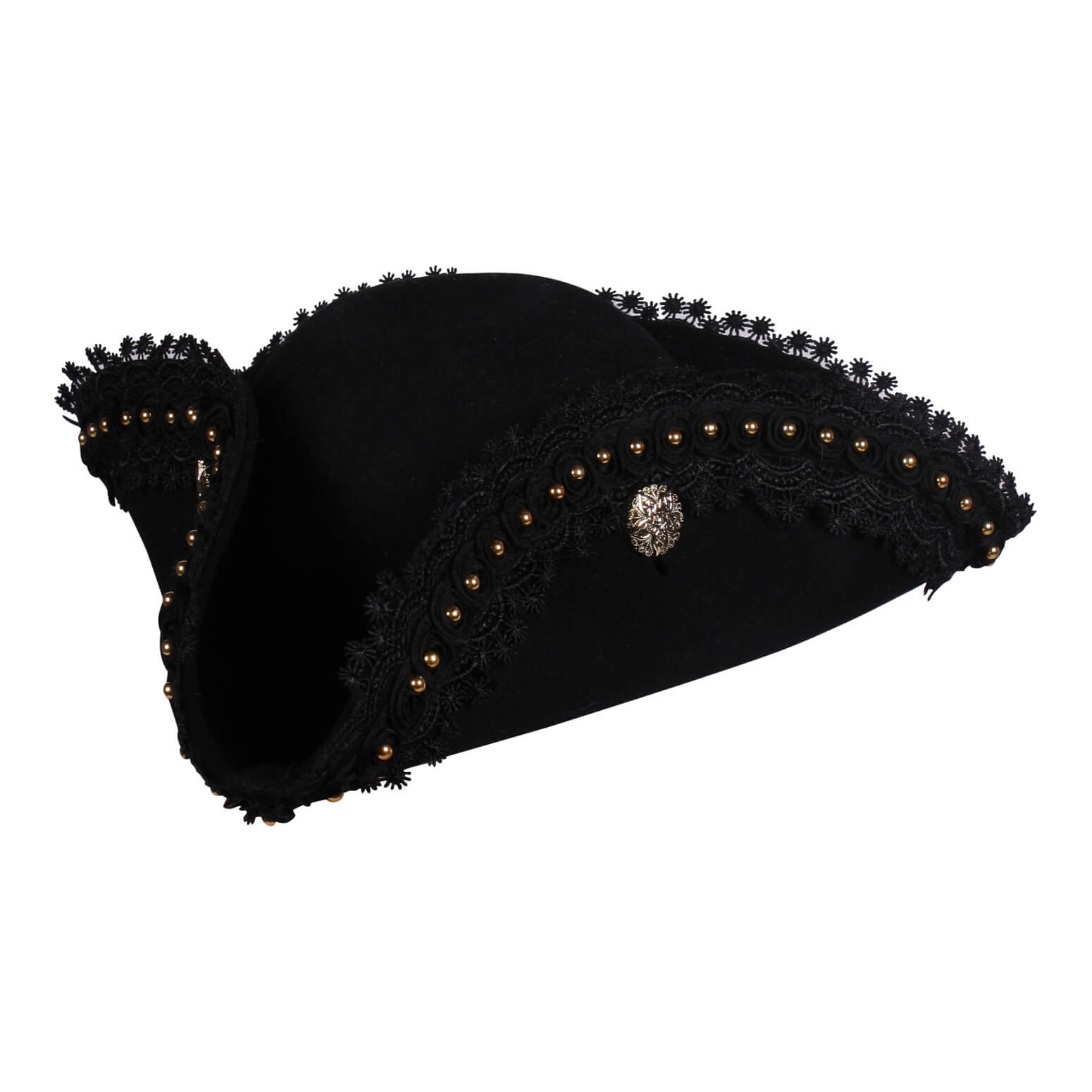 Edelleute / Piraten Dreispitzhut Wollfilz mit Spitze und Perlen Deluxe PEARL schwarz-gold