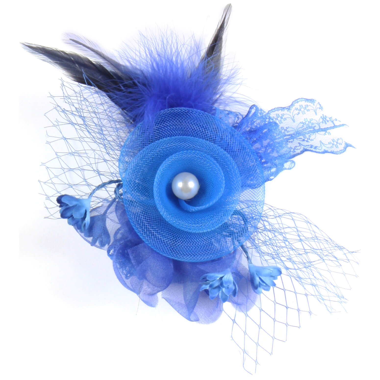 Saloon Can-Can Brosche Hutanstecker Kopfschmuck Blume mit Federn Tüll und Perle blau – (ARTIKEL/REFERNZ: 8717653300105/TT3625BLOnesi – Kategorie/Suche: – Hersteller: Thetru BV)