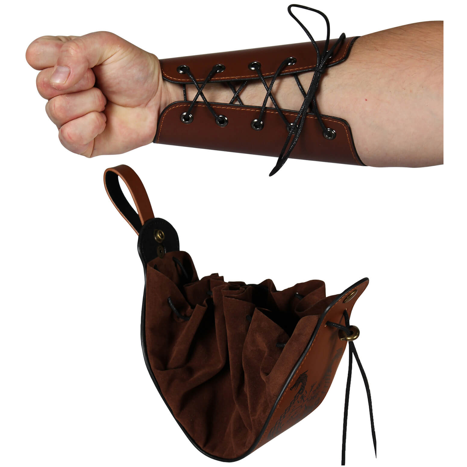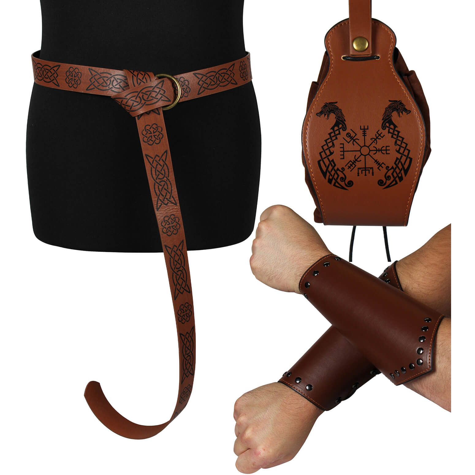 Mittelalterliche / Wikinger Armschienen+Gürtel+Beutel Set Deluxe Lederoptik mit Prägung braun