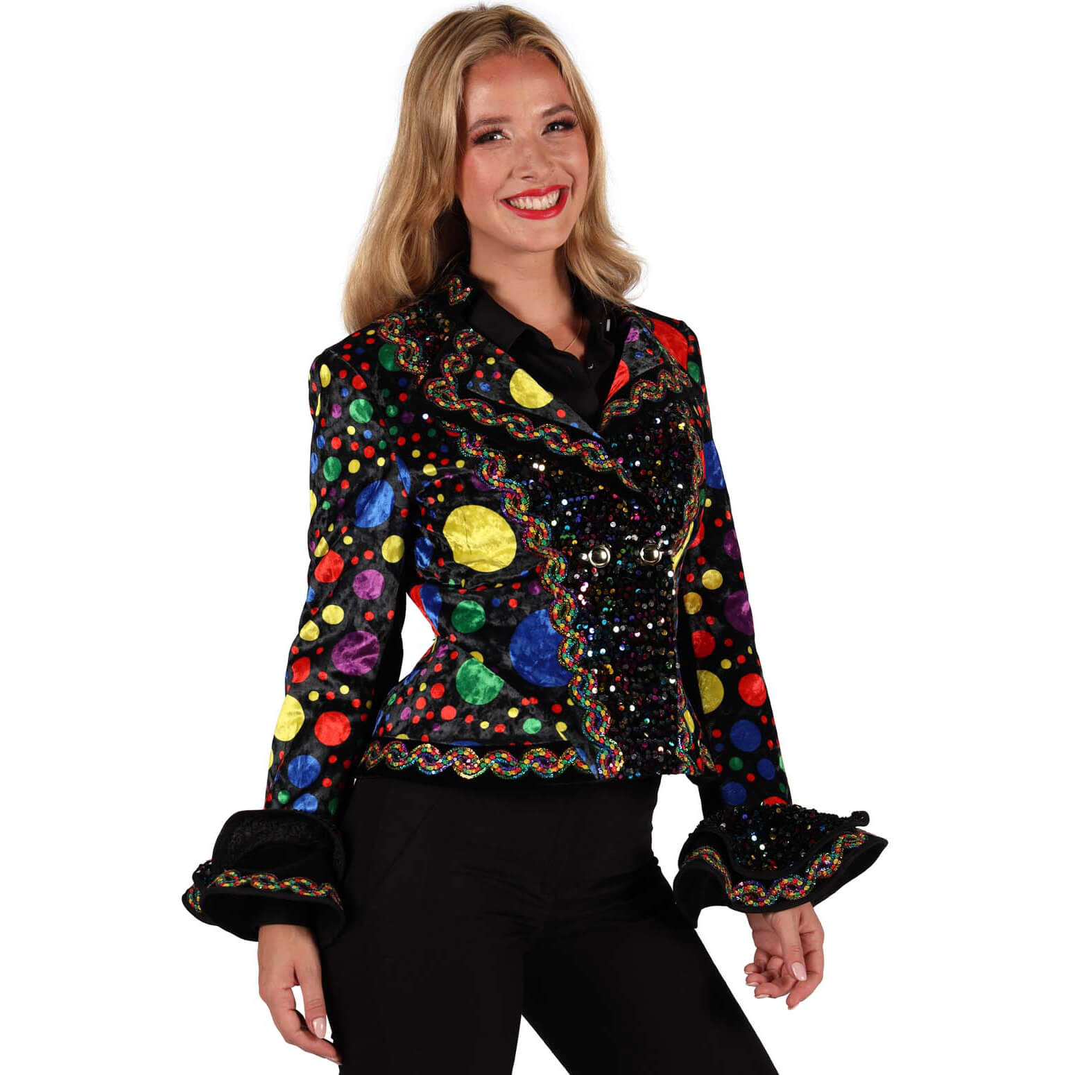 Clown Harlekin Jacke aus Samt mit Punkten und Rüschen 1000 STARS schwarz-bunt