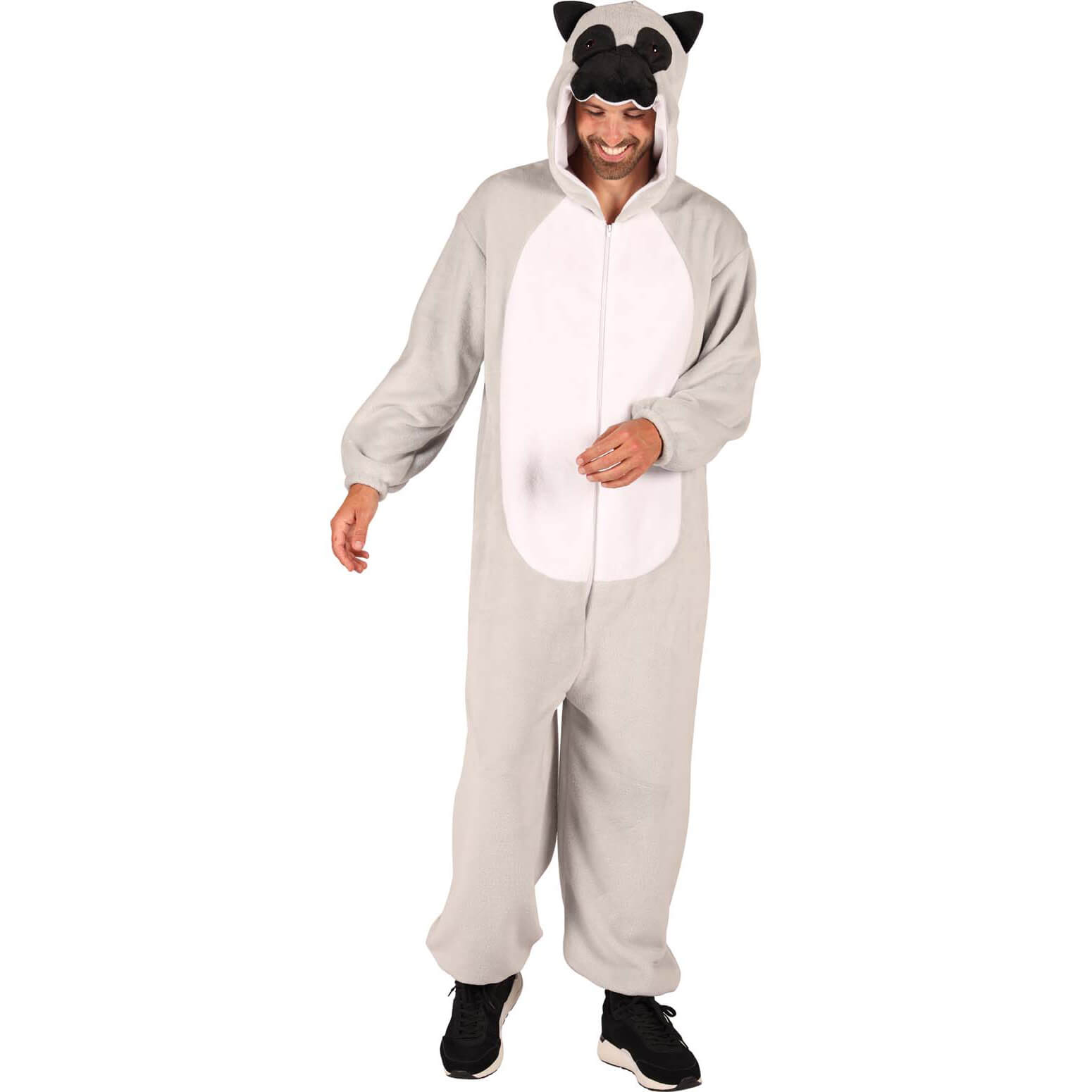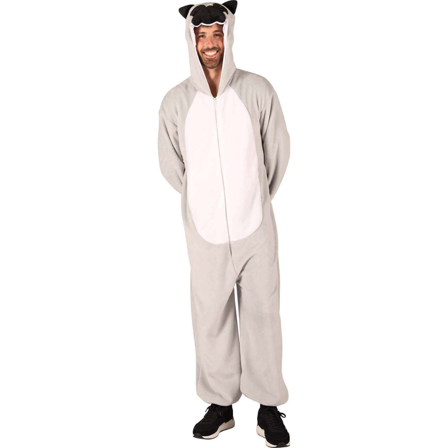 Hund Plüschkostüm Overall Plüsch Deluxe mit Kapuze Mops BENNY grau-weiß