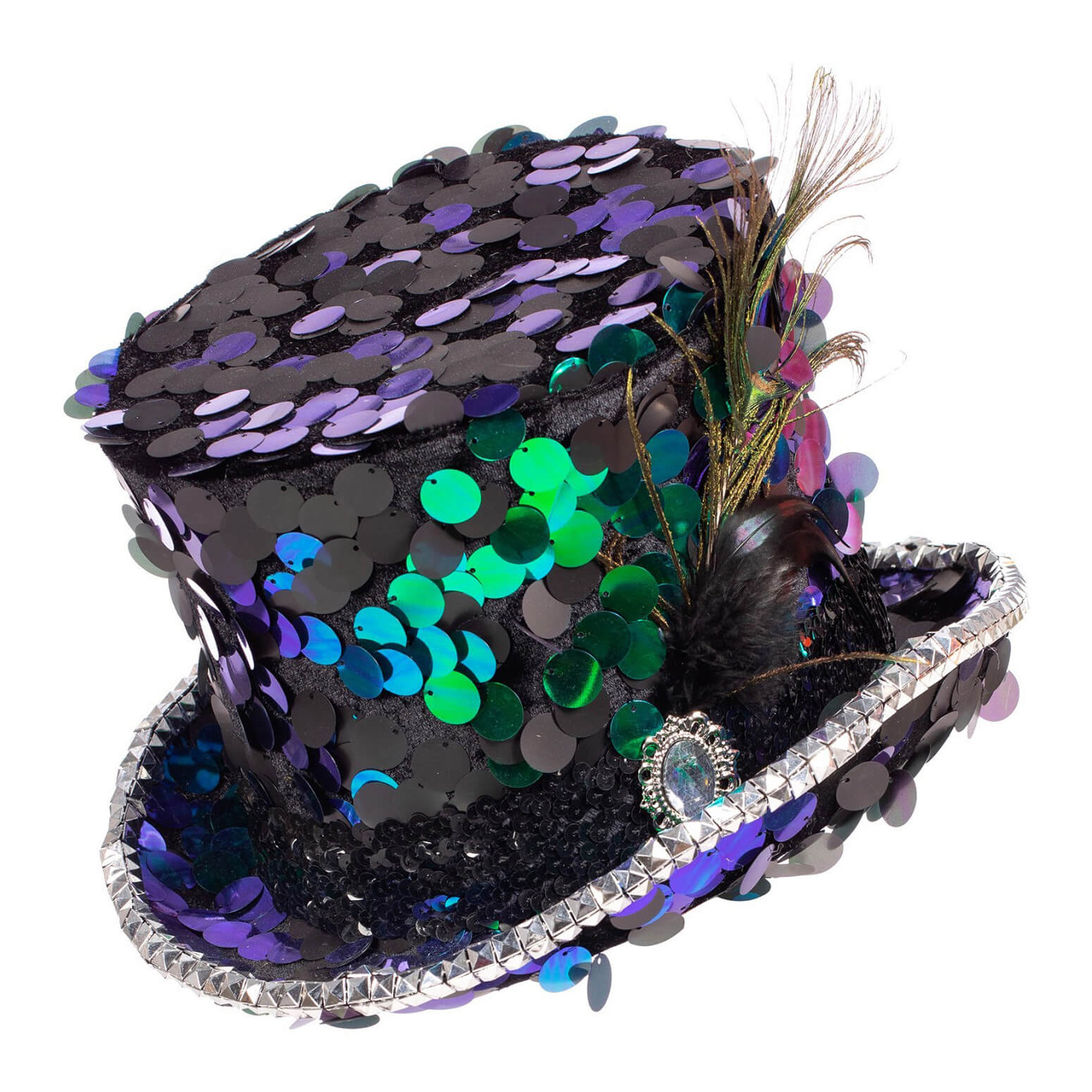 Show / Saloon Zylinderhut mit Paillette Superdeluxe mit Pfauenfeder lila-grün