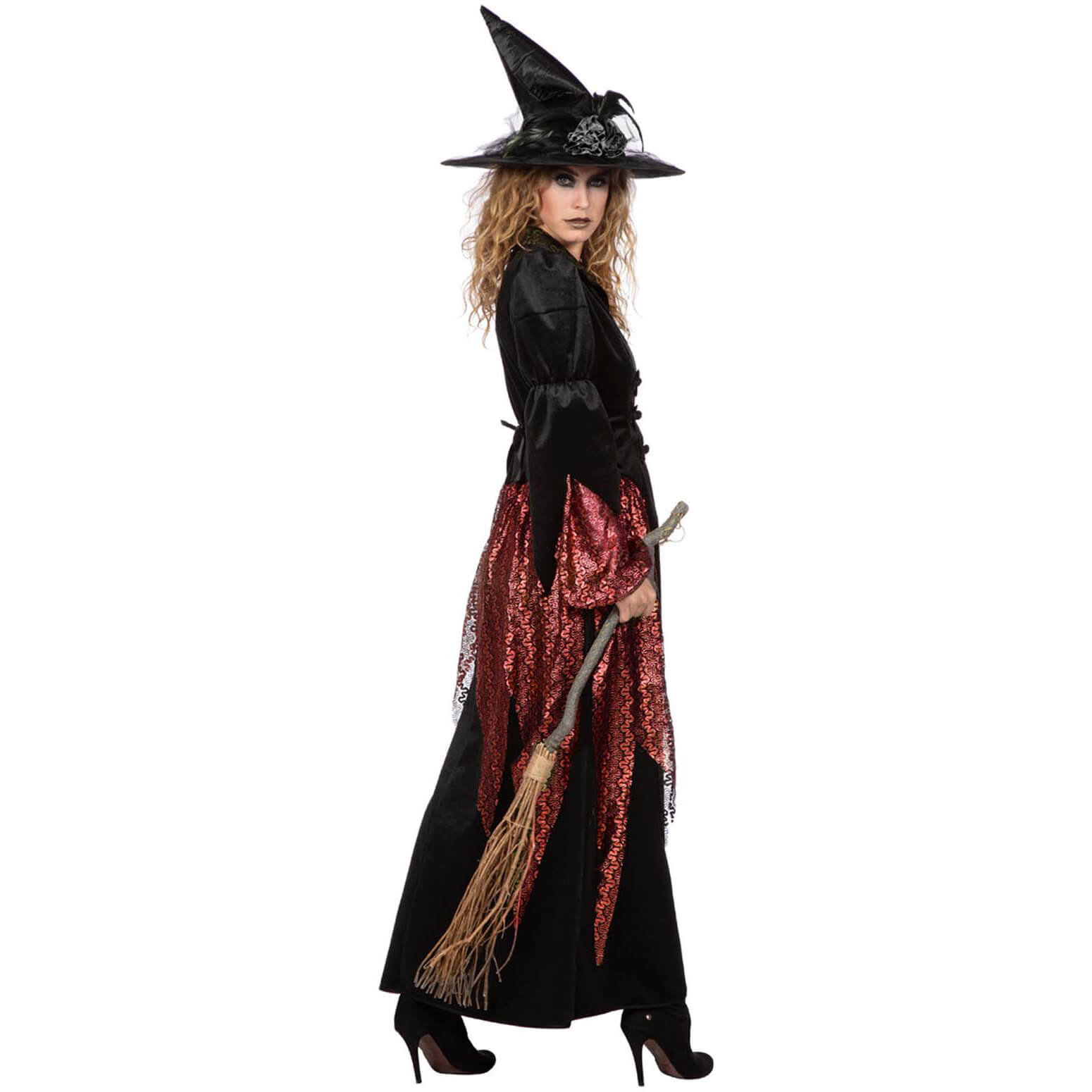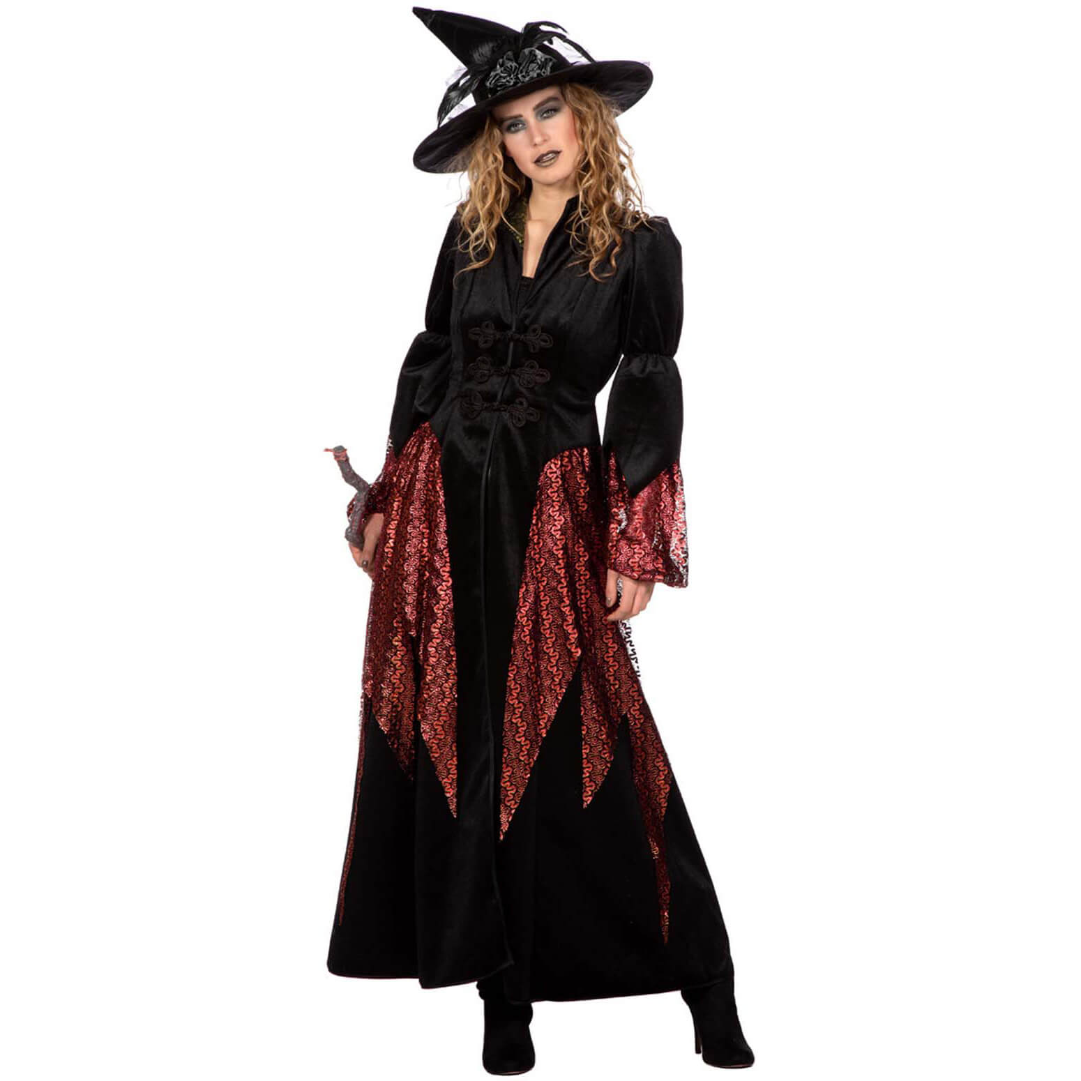 Hexe Kostüm Kleid lang aus Samt mit Spitze Deluxe schwarz-rot