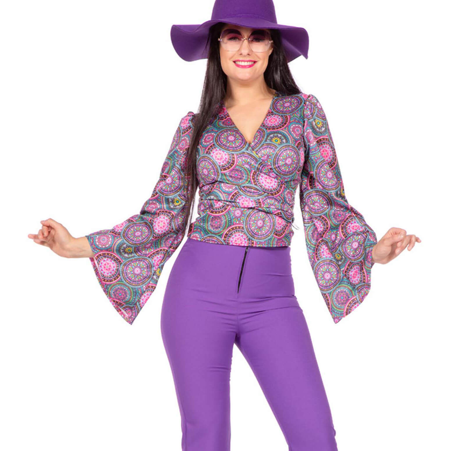 70er Jahre Hippiegirl Hemd Bluse Wickelbluse lila-bunt – (ARTIKEL/REFERNZ: 8720059051915/WB435836-8720059051922/WB435838-8720059051939/WB435840-8720059051946/WB435842-8720059051953/WB435844-8720059051960/WB435846 – Kategorie/Suche: – Hersteller: Wilbers & Wilbers)