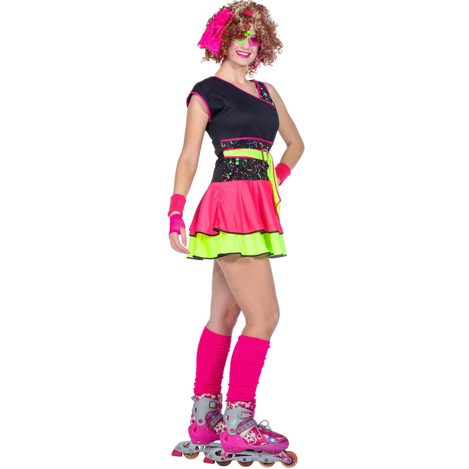 80er Jahre Dame Kostüm Kleid kurz mit asymmetrischer Schulterpartie neonbunt