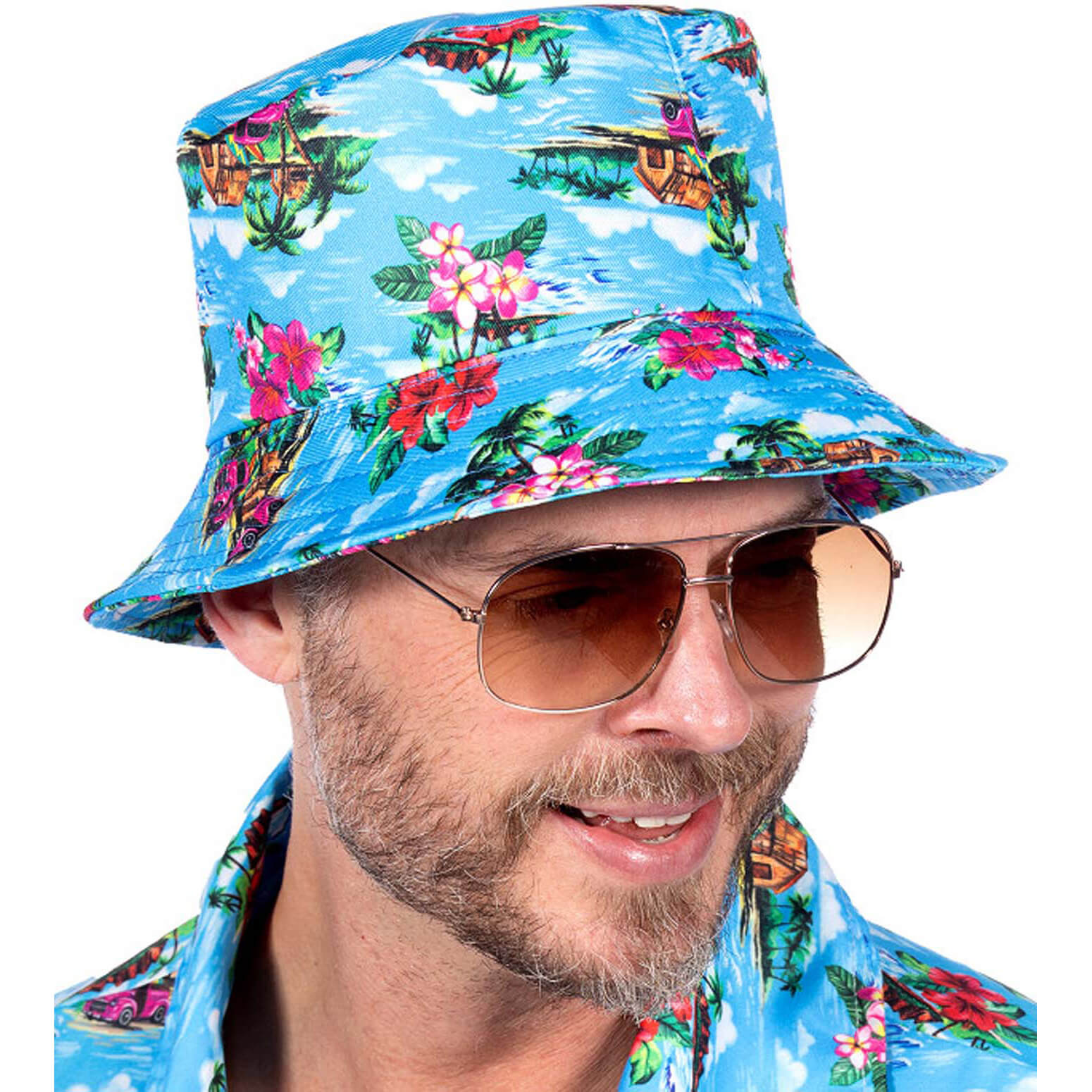 Hawaii/Blumen Eimerhut Fischerhut mit Wassser und Blumen zu Turistenkostüm blau-bunt – (ARTIKEL/REFERNZ: 8720059071555/WB9328 – Kategorie/Suche: Anglerhut Buckthat – Hersteller: Wilbers & Wilbers)