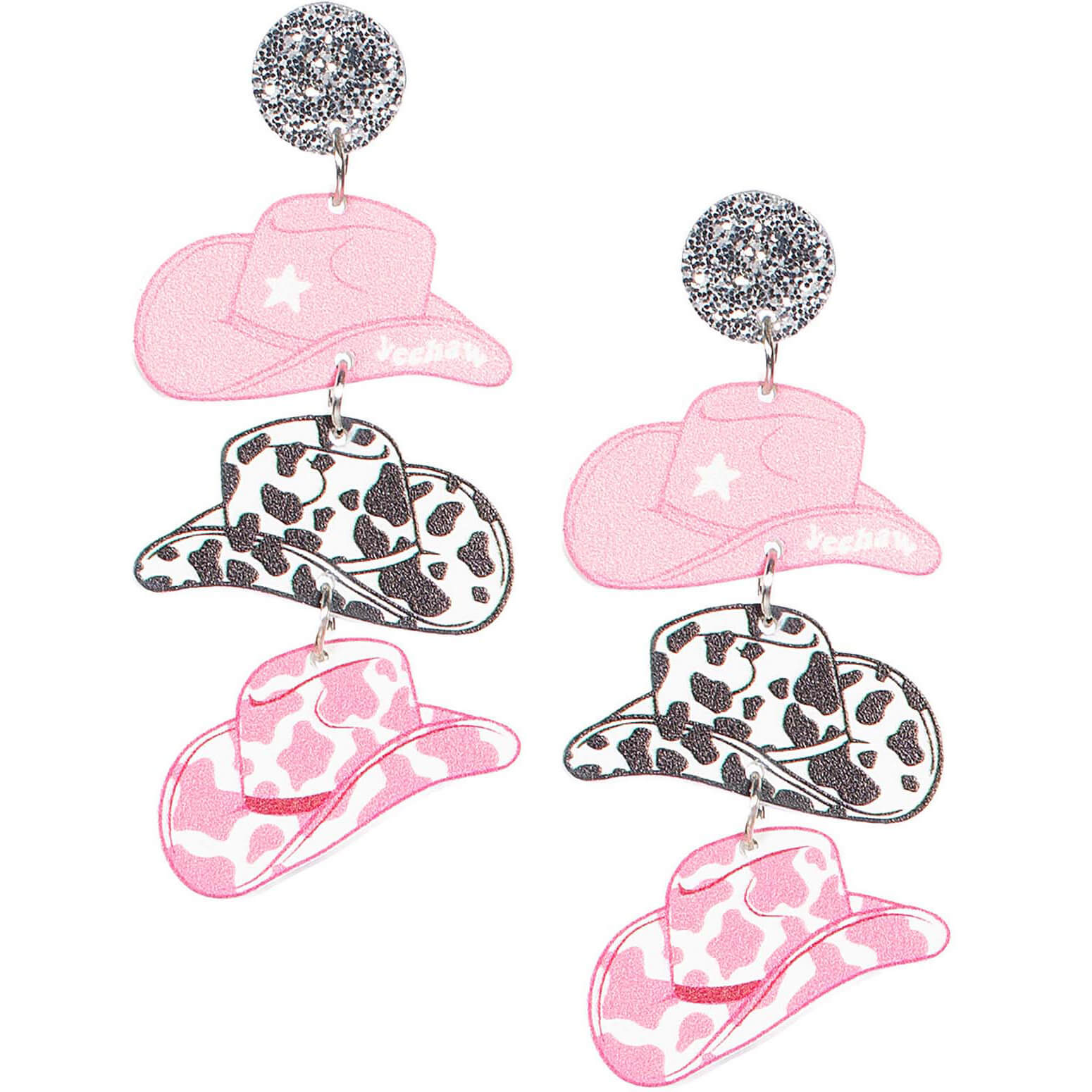 Cowgirl Cowboy / Festival Ohrringe mit Glitzer Motiv Coboyhut drei übereinander rosa-schwarz