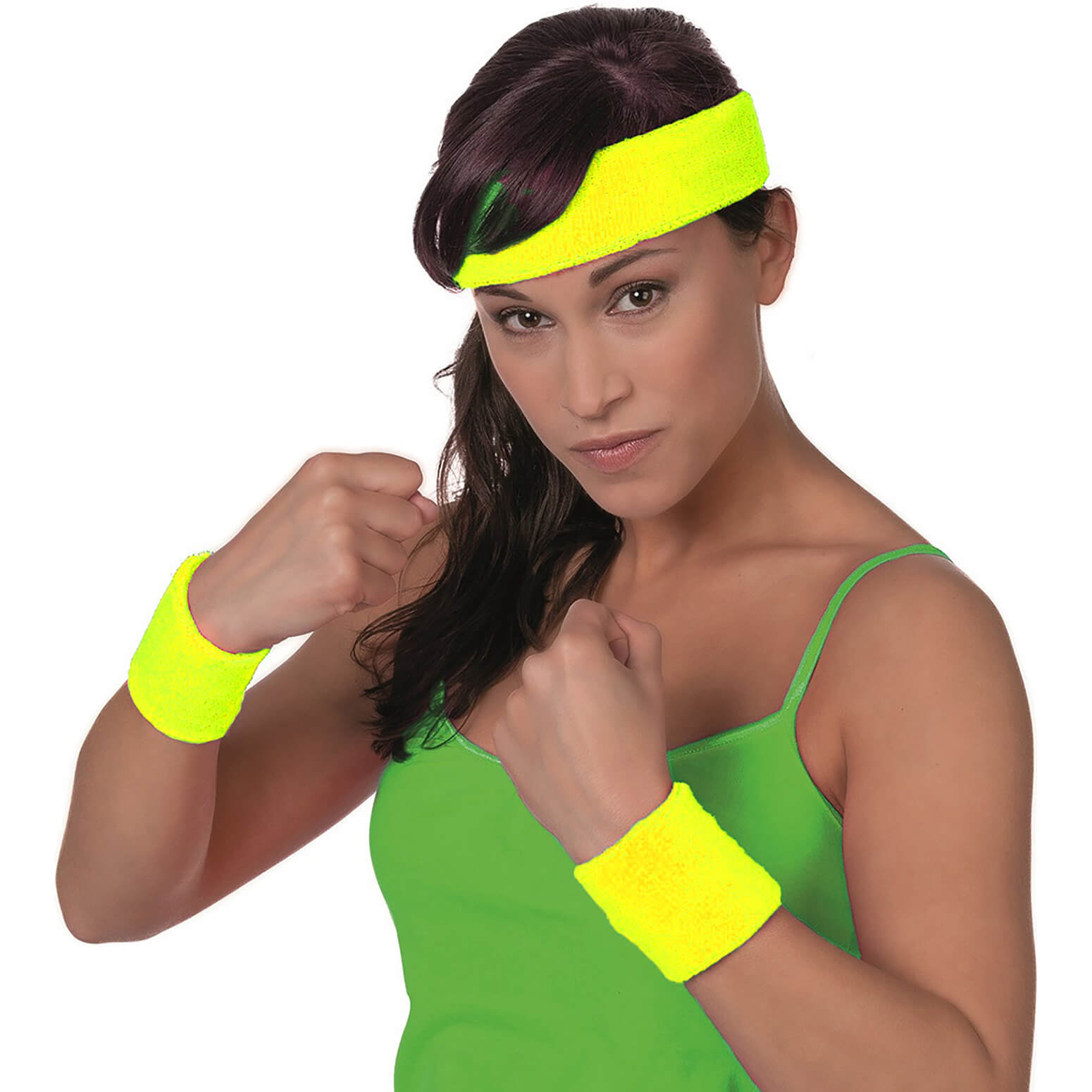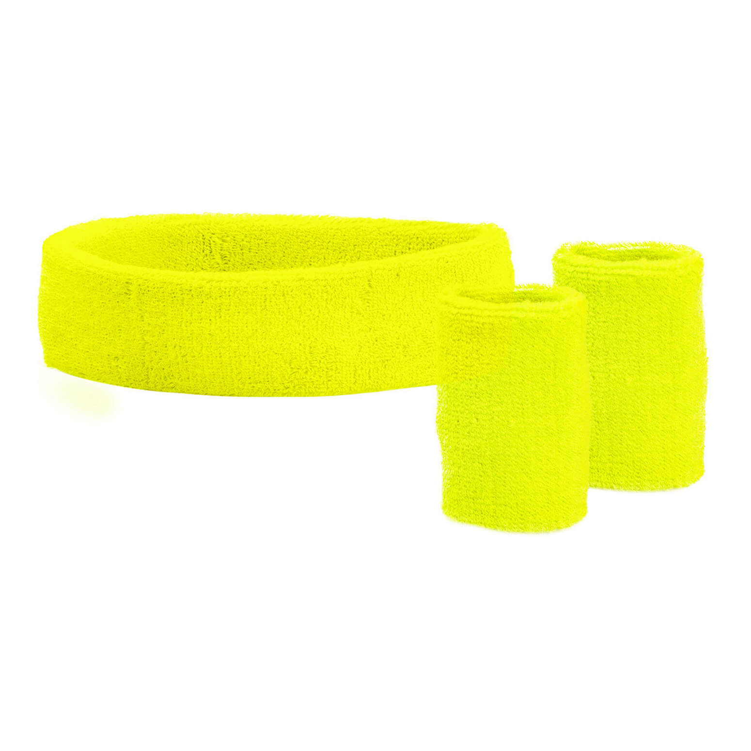 80er Jahre Aerobic Schweißband Set Stirnband+Handgelenkschweißbänder Deluxe neongelb