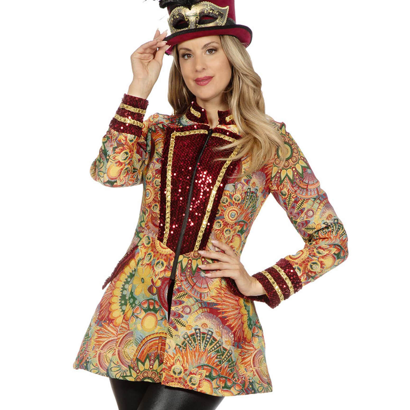 Edeldame / Zirkusdompteurin Jacke Gehrock Gobelin Superdeluxe mit Sonnen und Blüten orange-dunkelrot