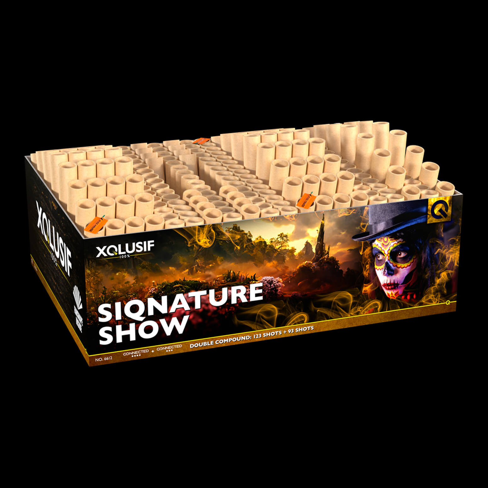 Batteriefeuerwerk Signature Show – Sehr dicker Doppelverbund mit verschiedenen Schussrichtungen, wie Fächerform, W-Form, Z-Form und I-Form. Sie werden in verschiedenen Tempi mit knallharten Salven und unterschiedlichen Effekten abgeschossen. Jede Box hat auch ein Finale, was sie zu einem wahren pyrotechnischen Fest macht!- Kaliber: 25 mm